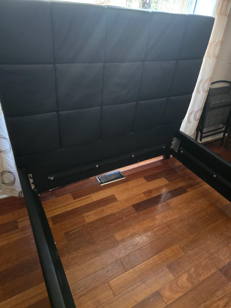 Selling a black bed frame. It's in good condition and ready for a new home. The frame features a padded headboard with a square pattern. Includes the slats for supporting the mattress. Two slats are missing, so the price is negotiable