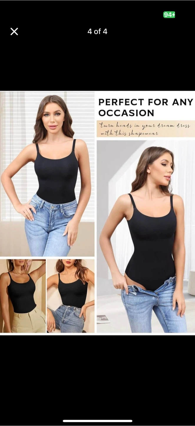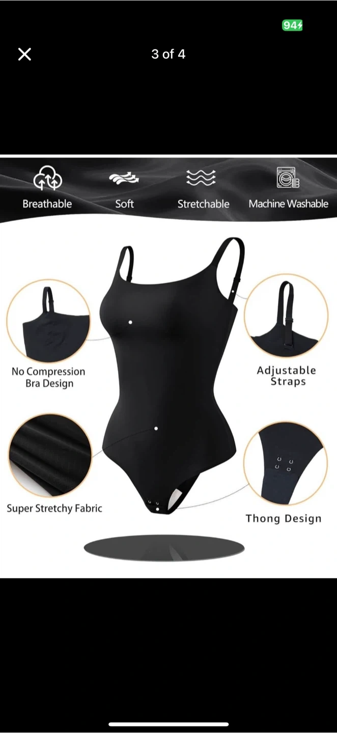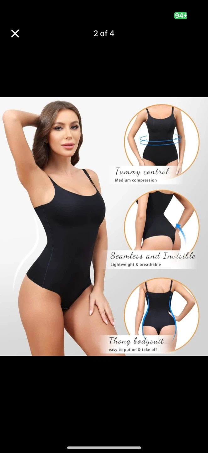 This black bodysuit offers tummy control with medium compression. It's designed to be seamless and invisible under clothing, and the material is lightweight and breathable. The thong design makes it easy to put on and take off. It also features adjustable straps and a super stretchy fabric for a comfortable fit