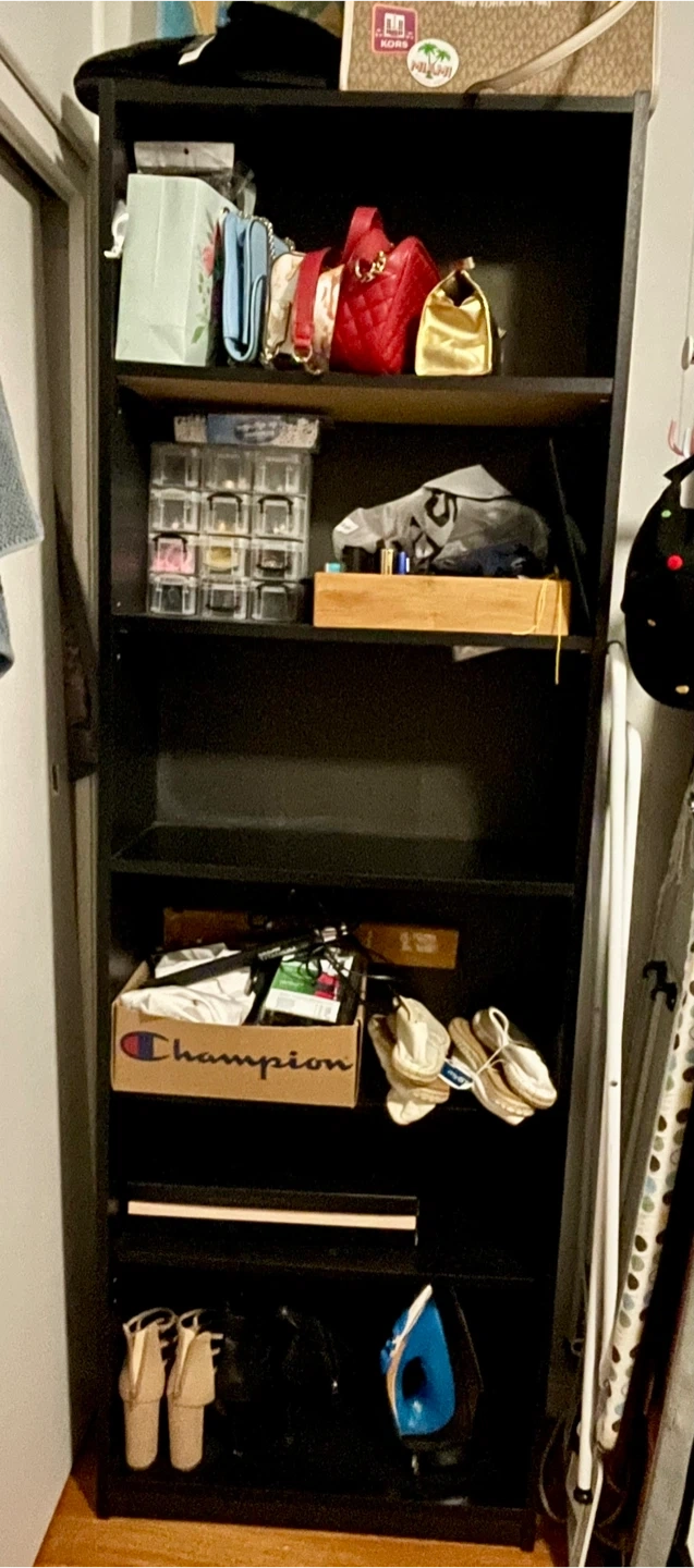 Selling a black bookshelf. It has multiple shelves and is in good condition. Perfect for storing books, bags, or other items! I have 2 of them! $25 each! Or both $40. 25inch W x 10inch D x 73inch H