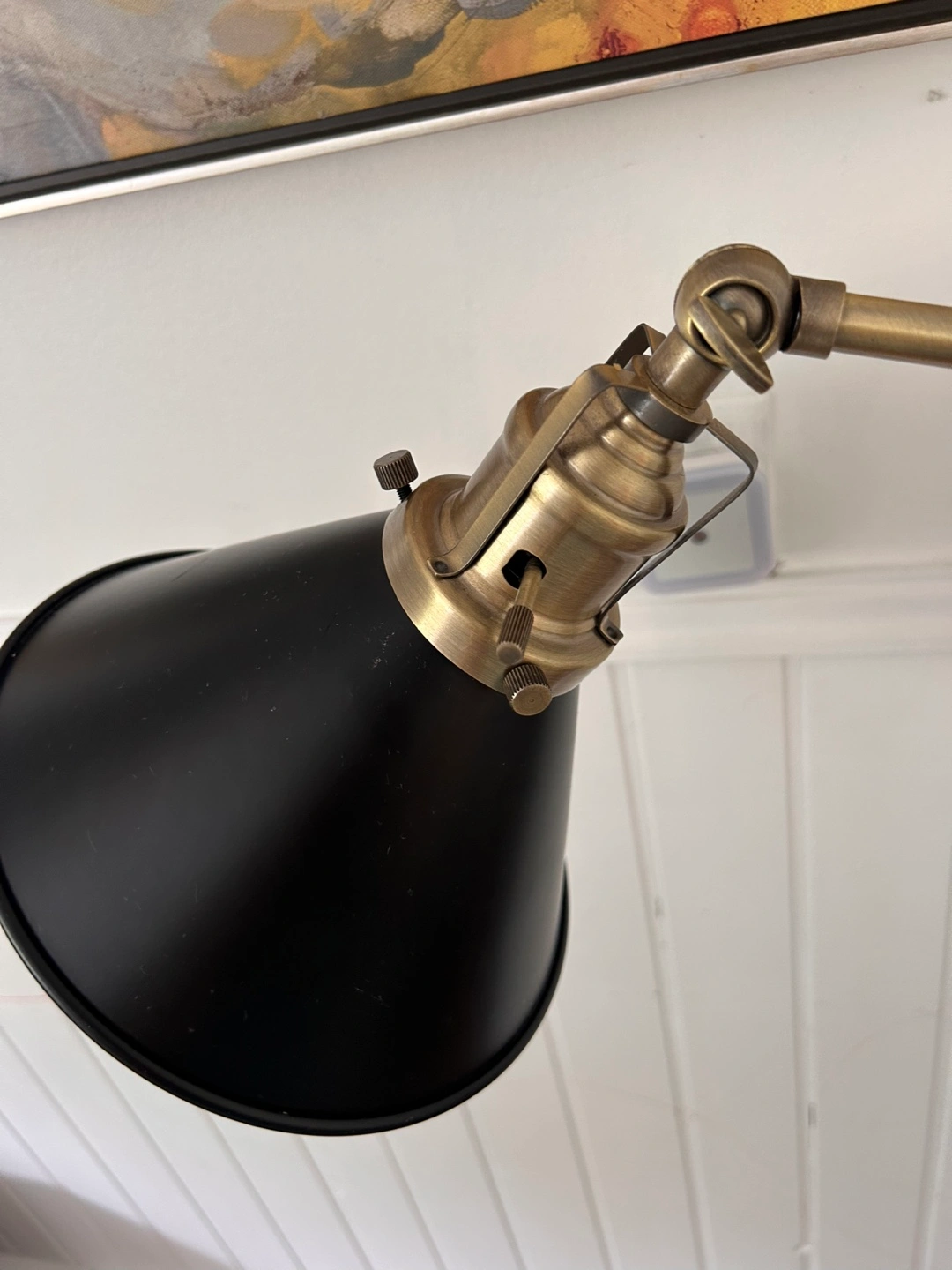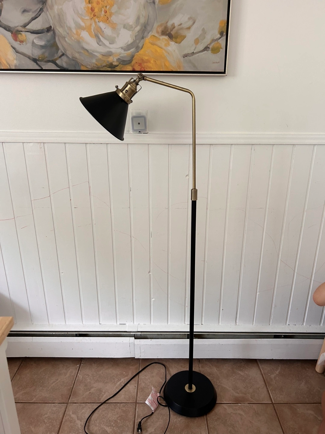 Selling a stylish floor lamp with a black shade and brass accents! It's in great shape and would add a touch of elegance to any room. The lamp is adjustable, so you can direct the light where you need it most