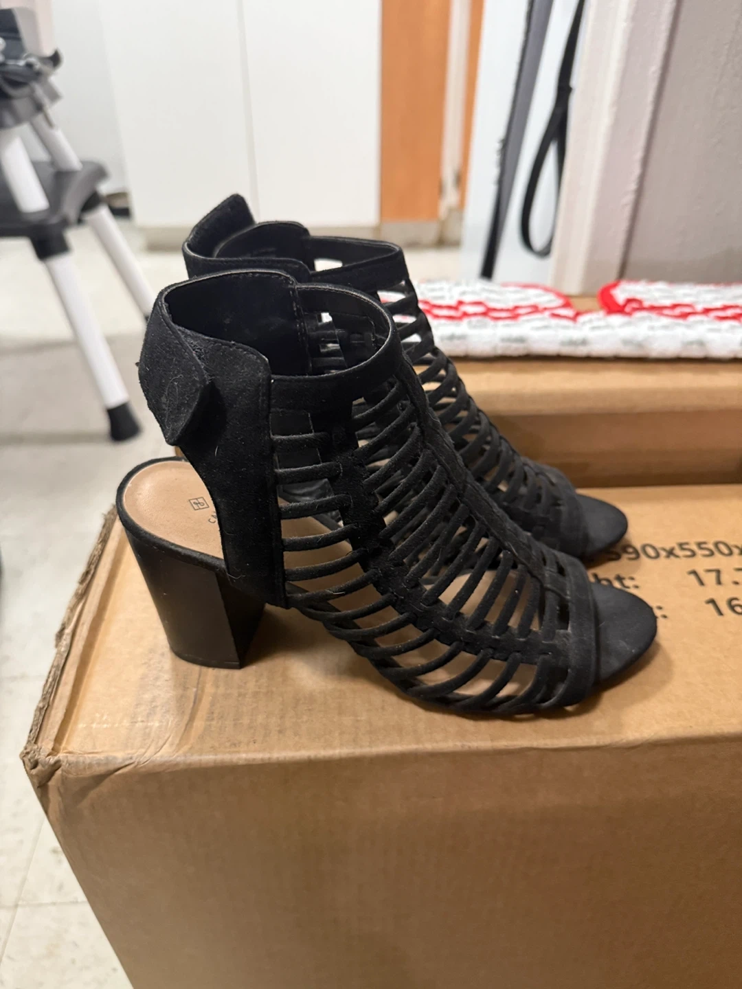 Selling a pair of stylish black cage heels! They are in great condition and would be a perfect addition to any wardrobe.