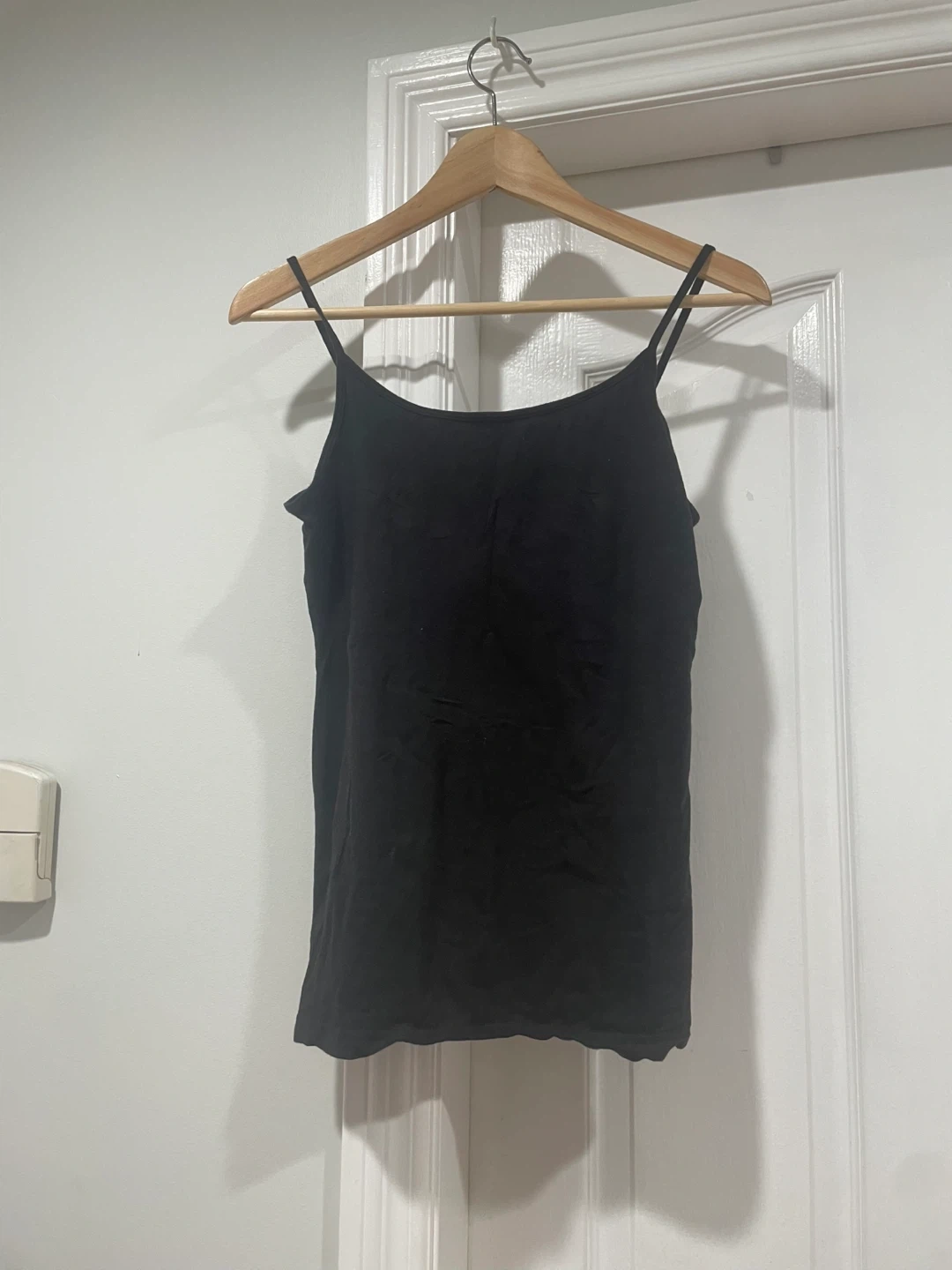 Selling a simple black camisole top! It's in great condition and would be a versatile addition to any wardrobe. Perfect for layering or wearing on its own during warmer weather. It's a comfortable and easy-to-wear piece!