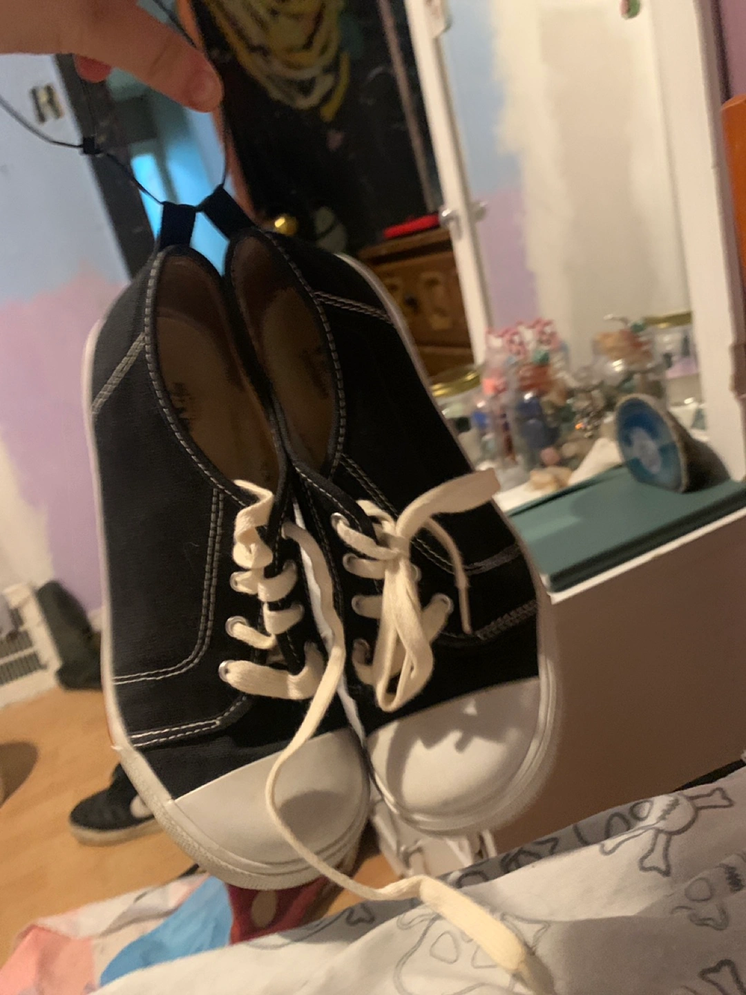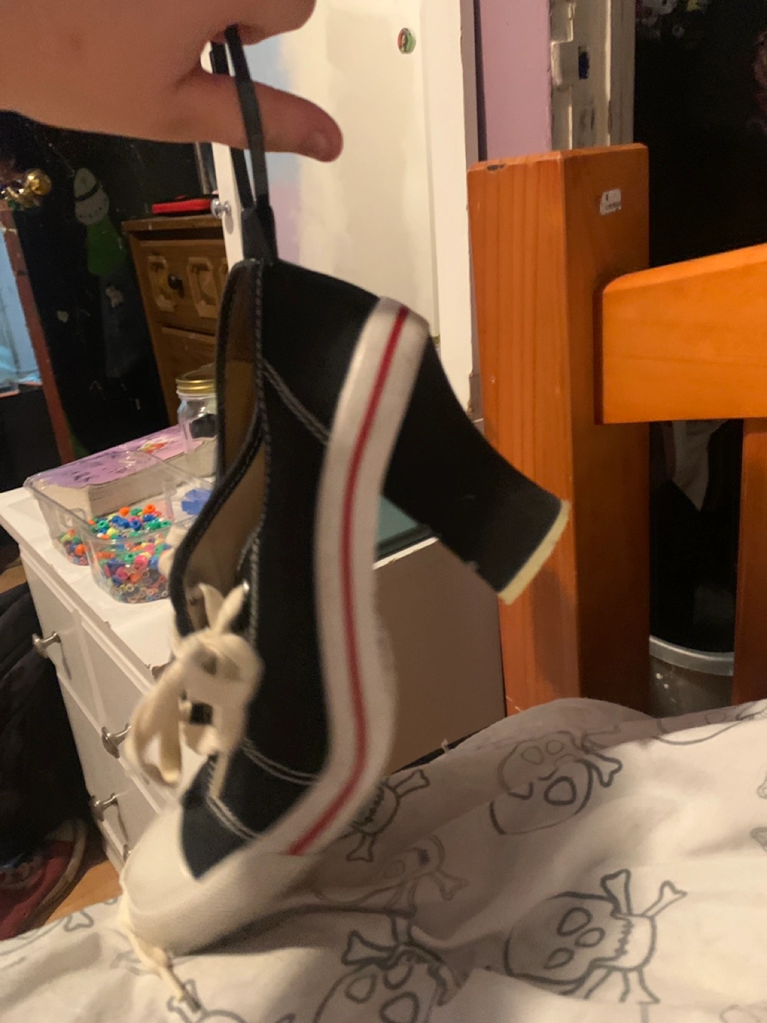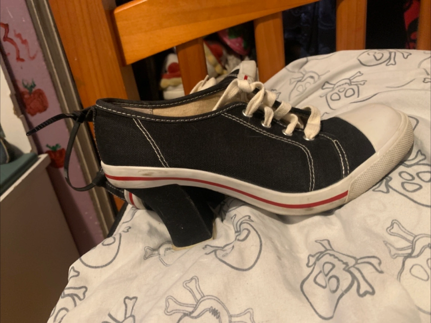 These are a pair of black canvas heeled sneakers. They have white laces and a white toe cap, with a red stripe detail on the heel. They are in good condition and i just wont use them anymore and just wanted to sell them u can offer less :25 or less