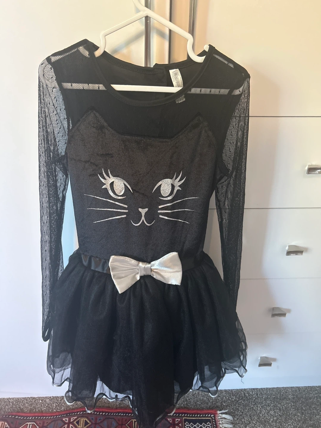 Cute black cat costume, perfect for Halloween! It features a sweet cat face design and a tulle skirt with a silver bow. The sleeves are a sheer mesh material. Great condition