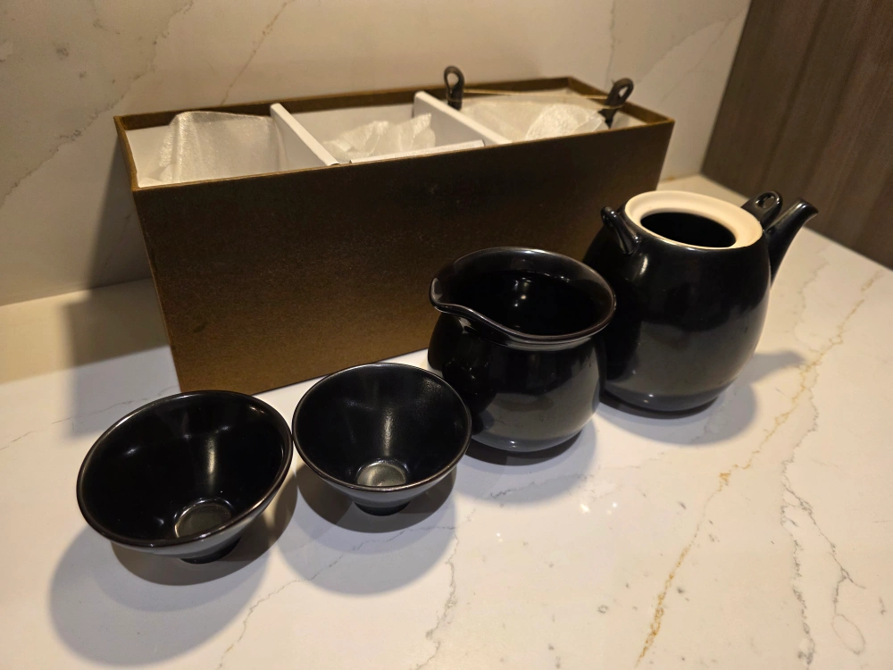 A beautiful black ceramic tea set, perfect for enjoying a relaxing cup of tea. The set comes with its original box, making it easy to store and protect. It includes a teapot, a creamer, and two teacups. The set is in great condition and ready to be enjoyed!