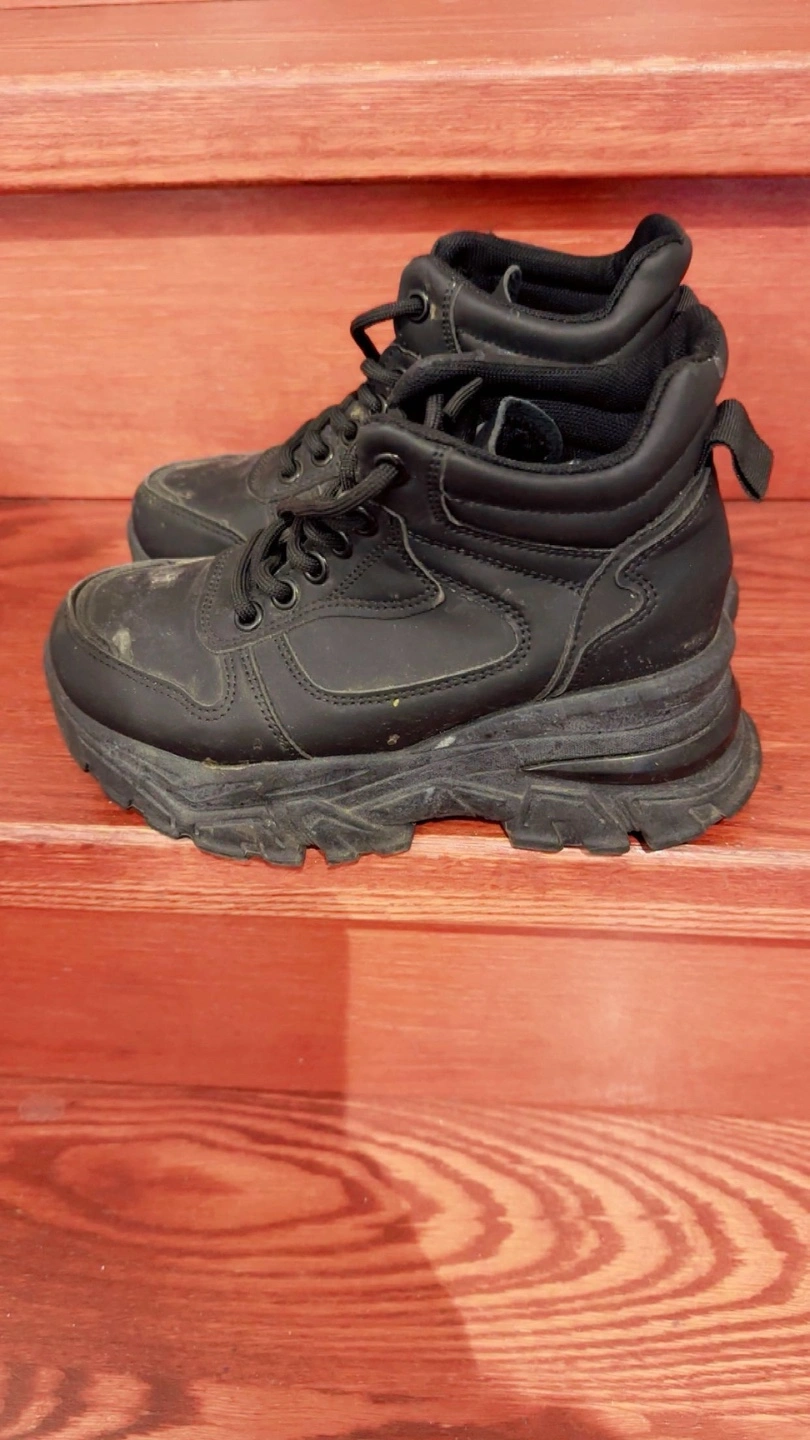 Pair of black, chunky platform boots. Lace-up closure. Minimal wear. Great for everyday use.