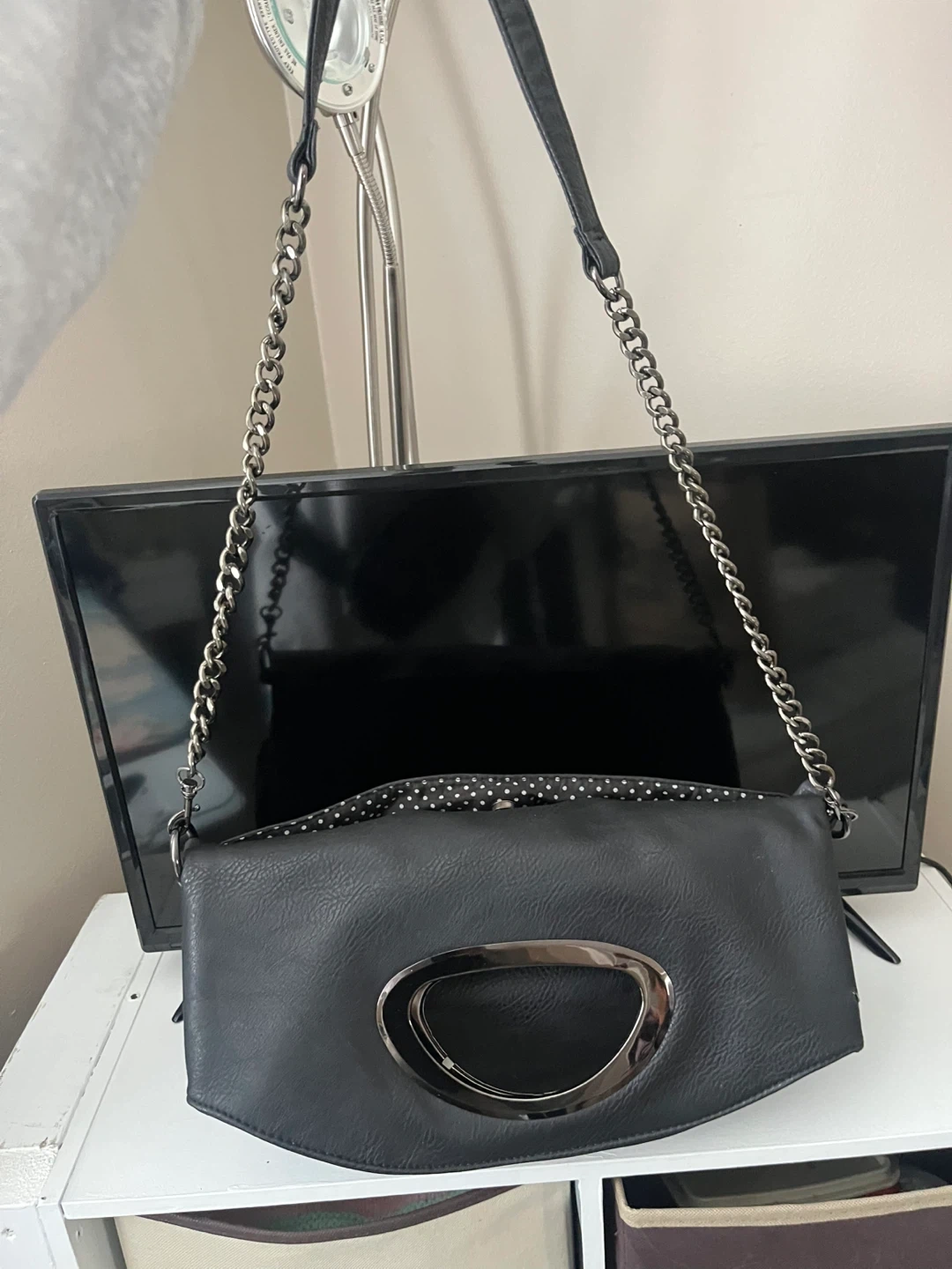 Stylish black clutch with a unique silver handle. It comes with a chain strap for over-the-shoulder wear. Perfect for a night out or special occasion
