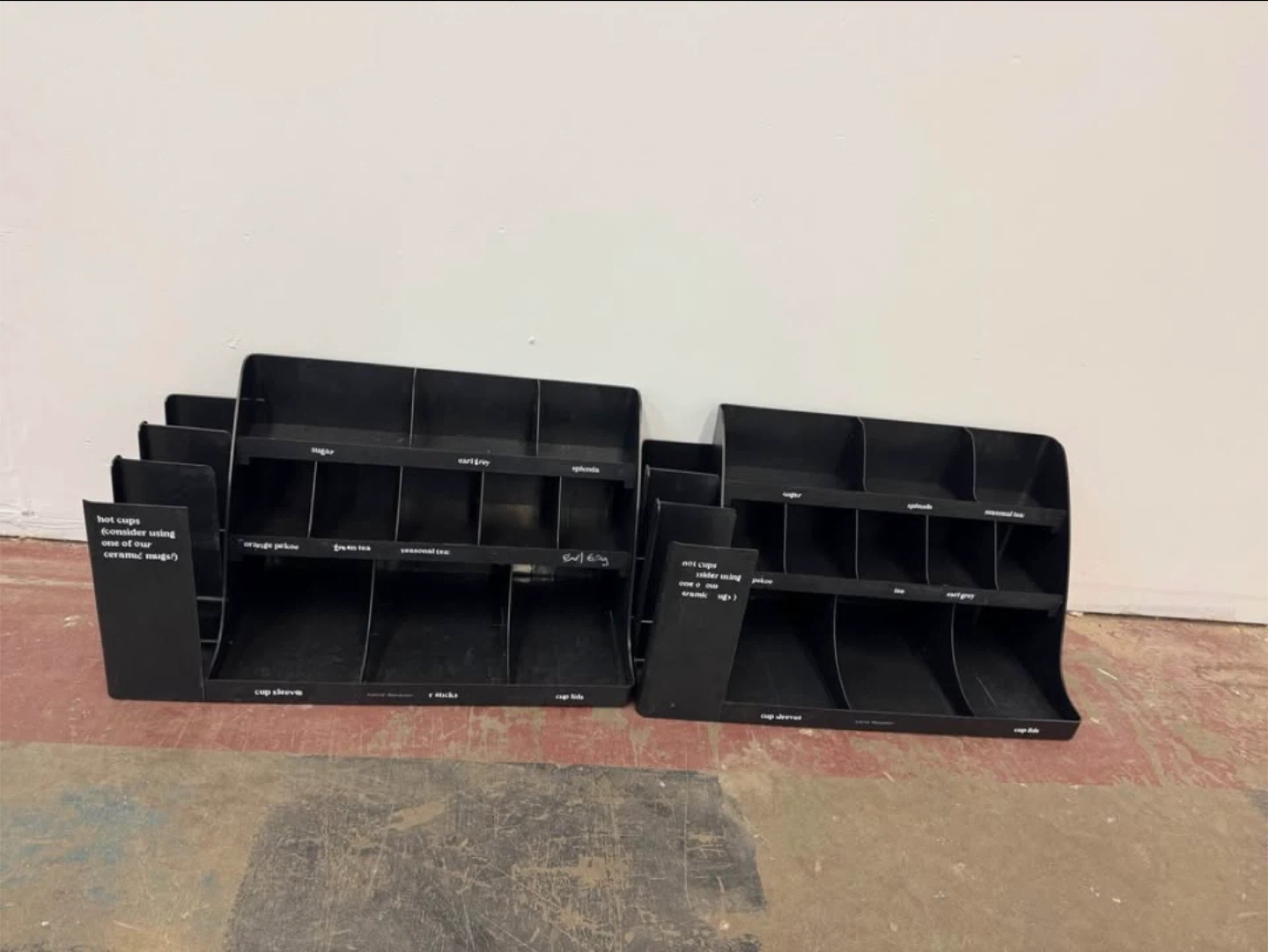 Here are two black Coffee/condiment organizers. They have slots for sugar, earl grey, splenda, orange pekoe, green tea, seasonal tea, cup sleeves, and cup lids. Perfect for organizing your coffee station!