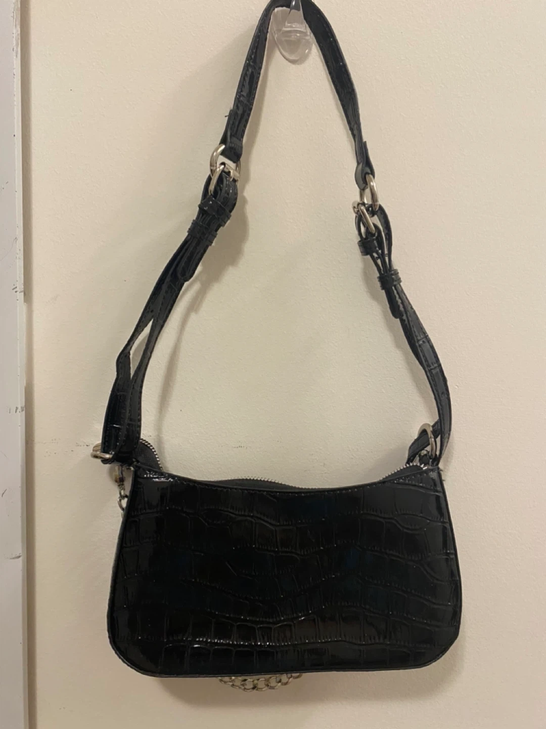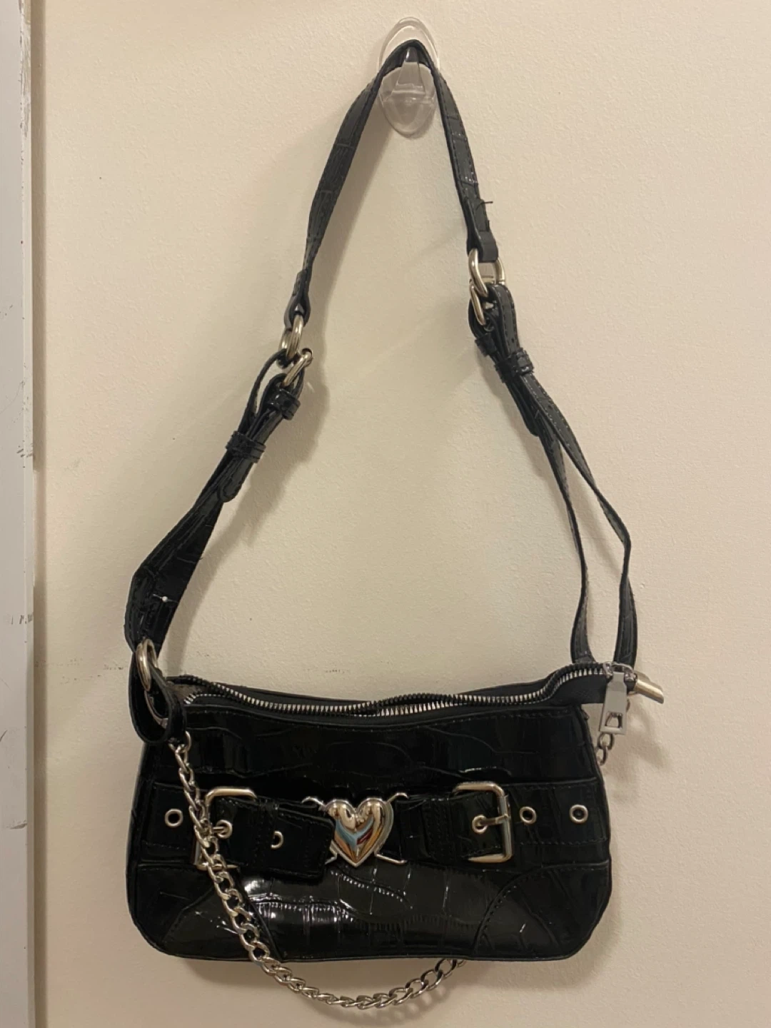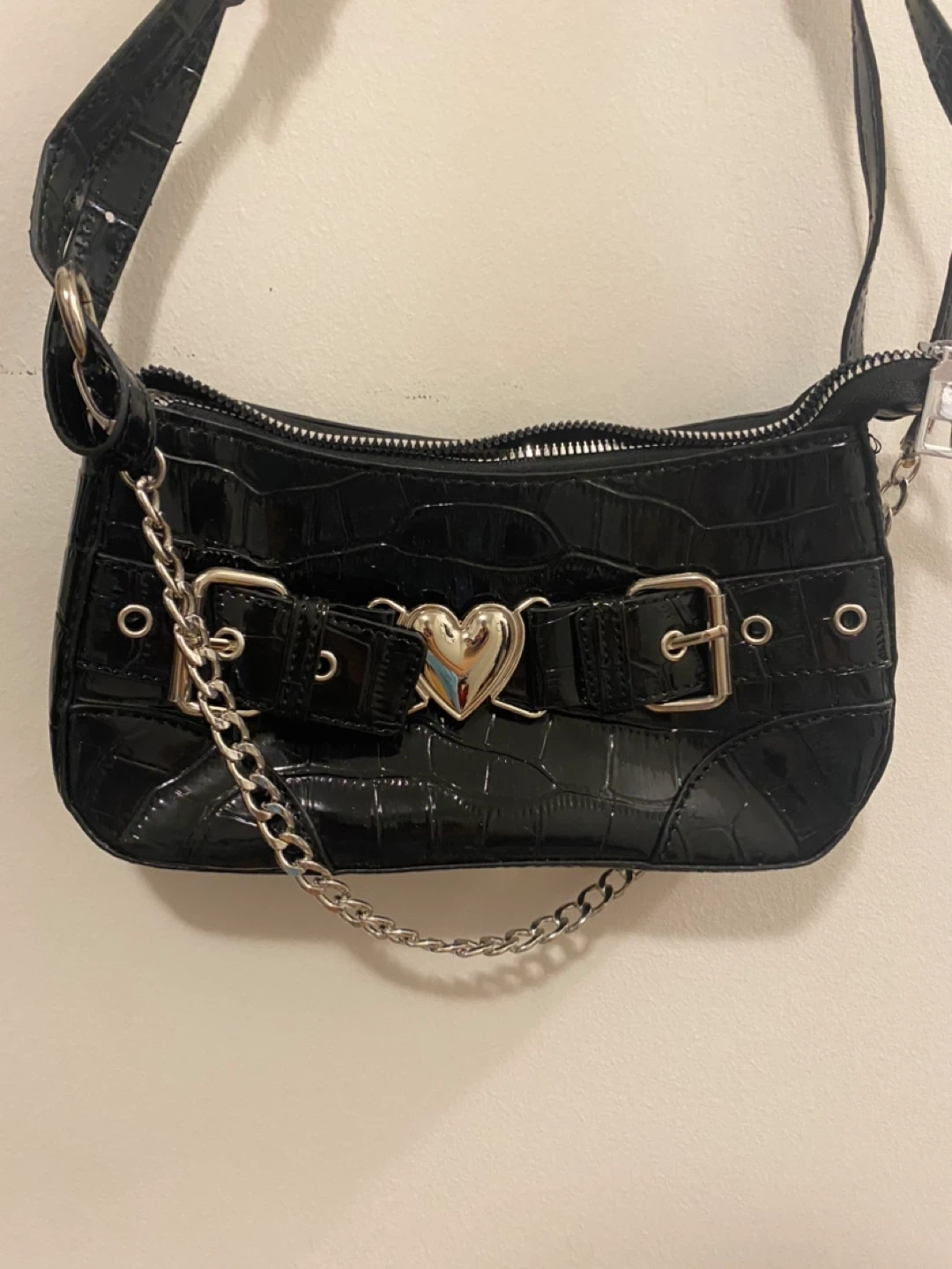 Selling a stylish black shoulder bag with a croc-embossed texture. It features a cute silver heart detail and chain accent