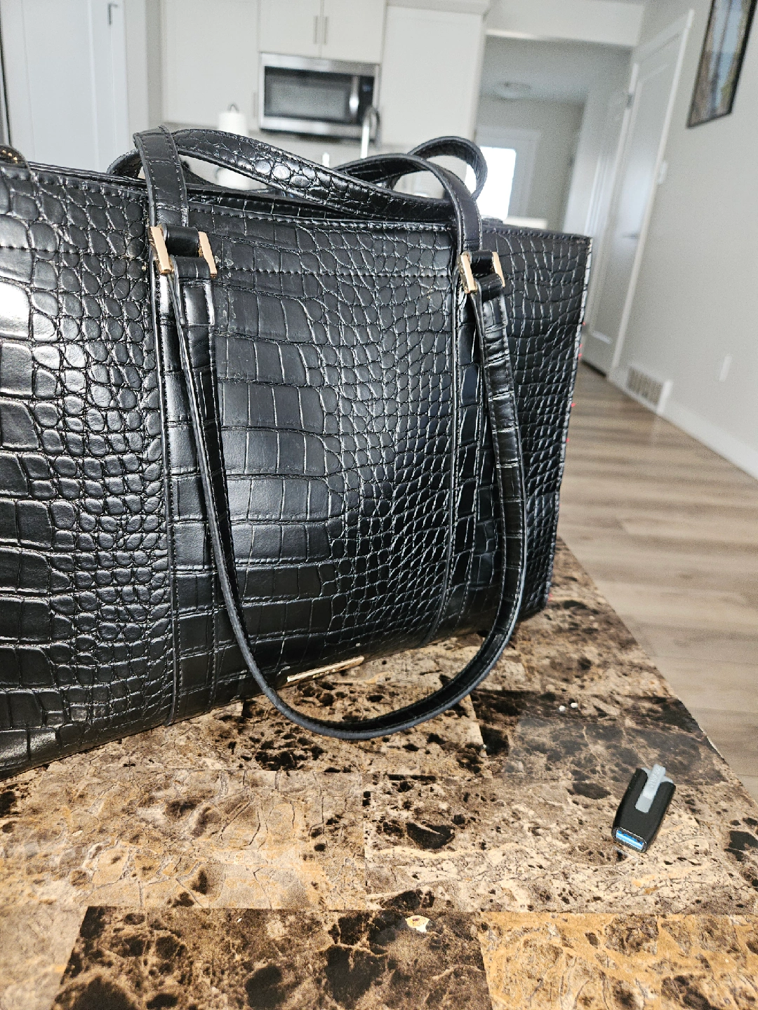 This is a stylish black tote bag with a croc-embossed texture. It's perfect for everyday use and adding a touch of sophistication to your outfit. The bag is in great condition and ready for a new home!