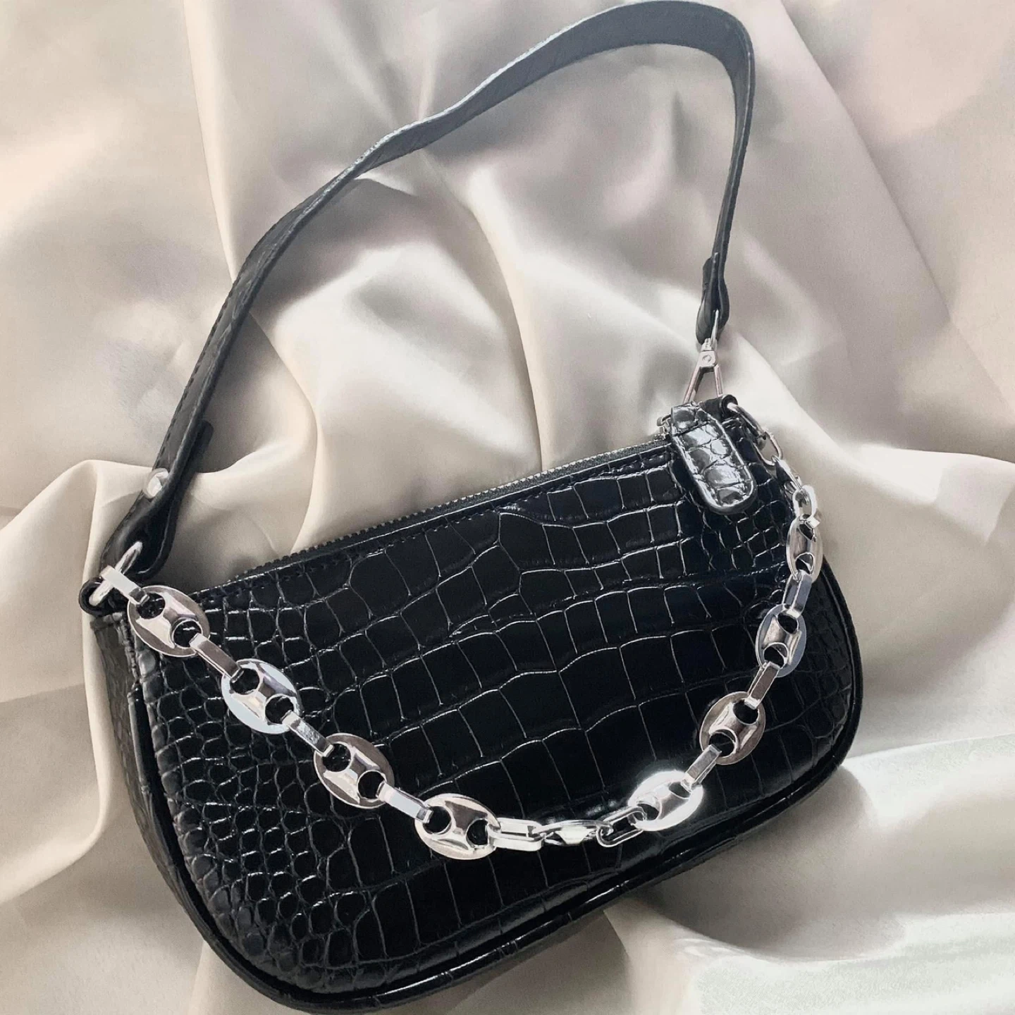 Cute black shoulder bag with a croc pattern and silver chain detail! It's in great condition and perfect for adding a bit of edge to any outfit