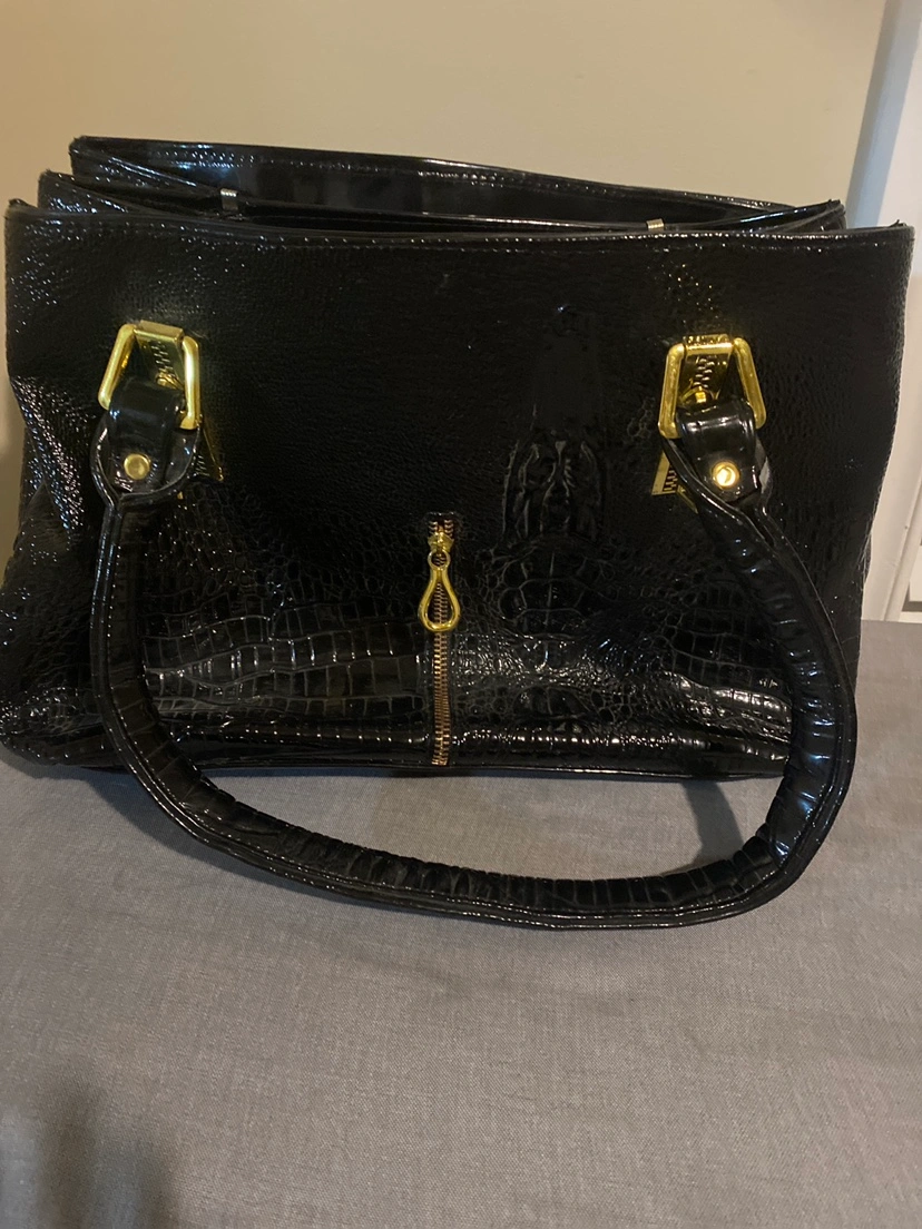 Black handbag with crocodile-embossed design. Features gold hardware and a zipper closure. It’s in an excellent condition Location Bristol and Kennedy Kindly check out the other items Thank you for your interest