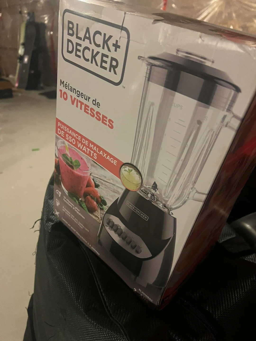 Black+Decker blender with 10 speeds and a 550-watt motor for powerful blending. It has pulse functions and cup measurements on the side. Perfect for making smoothies and other blended drinks!