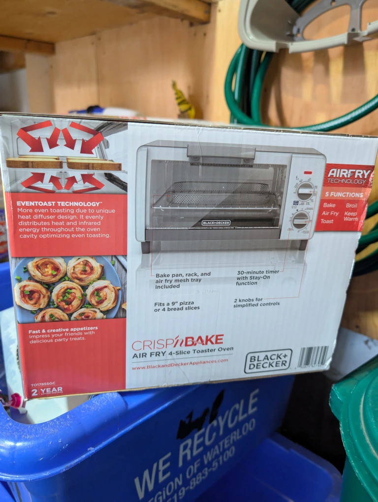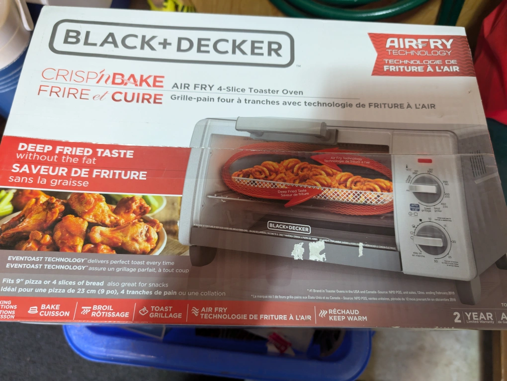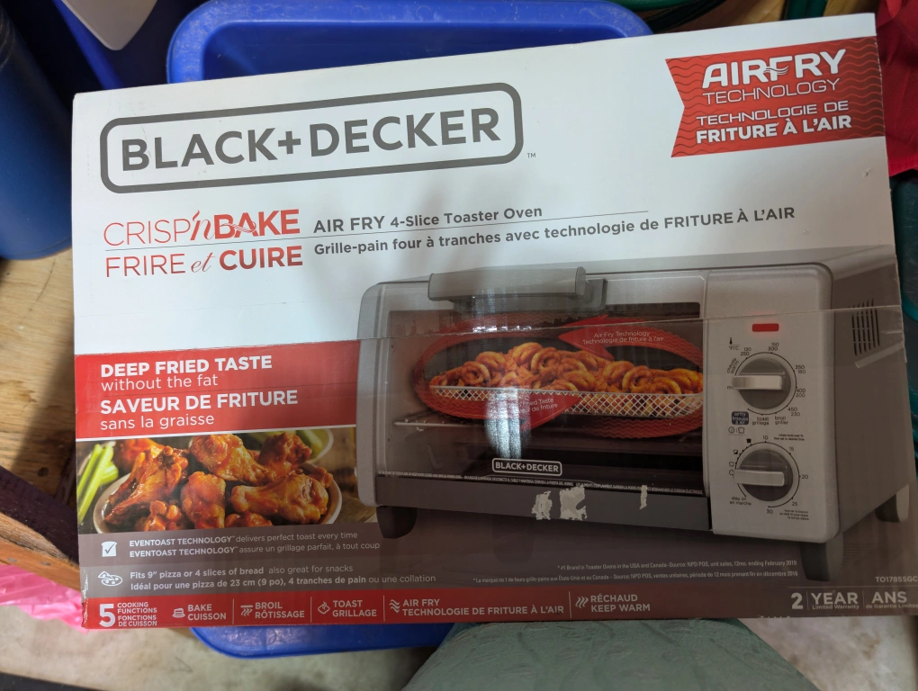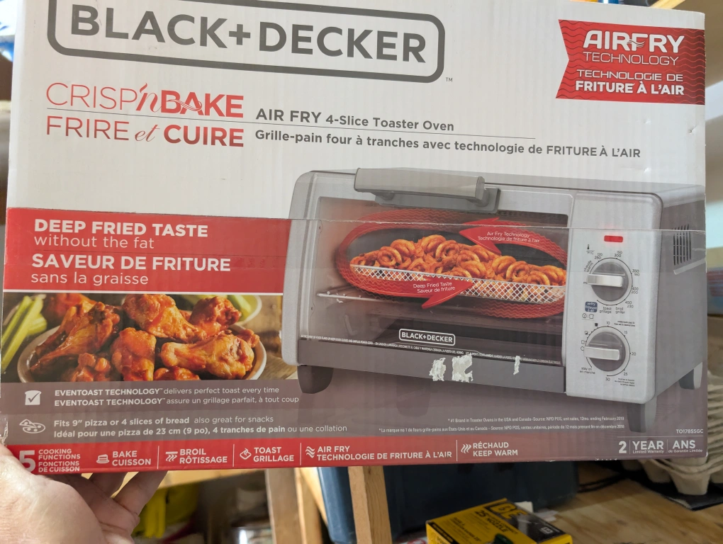 Get ready to enjoy crispy and delicious meals with this Black+Decker Crisp 'N Bake Air Fry 4-Slice Toaster Oven! It features air fry technology for that deep-fried taste without the fat. It fits a 9" pizza or 4 slices of bread, making it great for snacks or a quick meal. The box includes a bake pan, rack, and air fry mesh tray. It also has a 30-minute timer with a stay-on function and 2 knobs for simplified controls