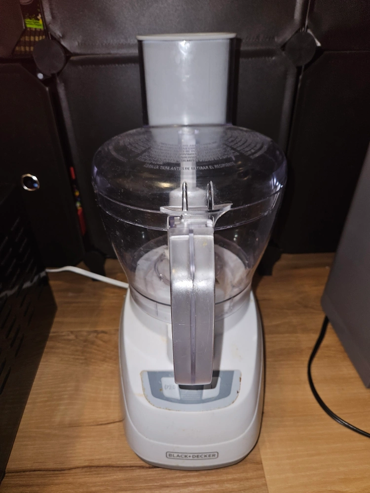 Selling a Black+Decker food processor. It's in good working condition and ready to help with your meal prep! It has a white base and a clear plastic bowl.