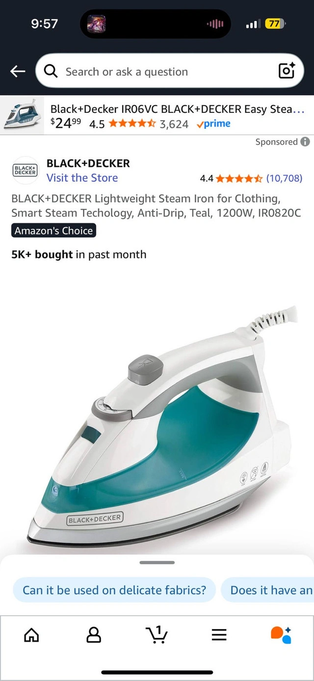 This is a Black+Decker lightweight steam iron, perfect for clothing with smart steam technology, anti-drip features, and a teal accent, operating at 1200W, model IR0820C. This iron has been lightly used and is in good condition, ready to make your garments look their best. Key Features: * Lightweight design for easy handling * Smart steam technology for efficient ironing * Anti-drip feature to prevent water spots * 1200W power for quick heating * Model: IR0820C