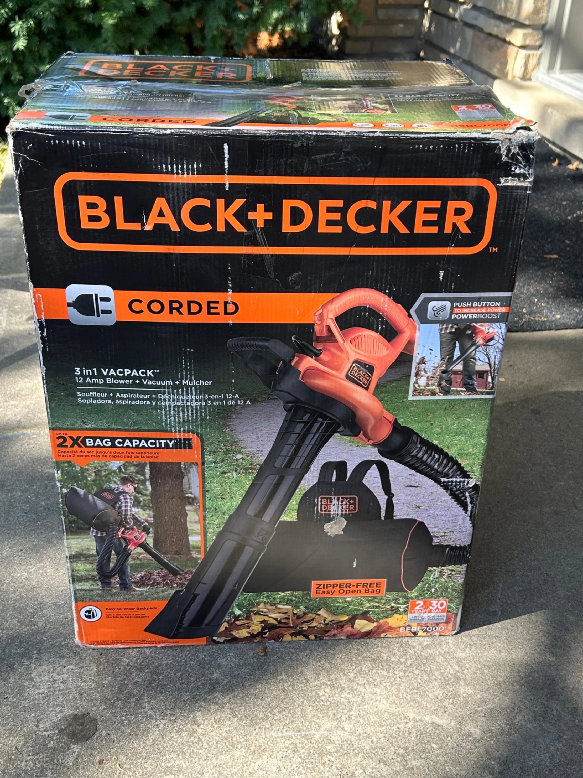 BLACK+DECKER Leaf Blower Vacuum Backpack & Mulcher (BEBL7000-CA) Keep your yard clean and tidy with this powerful 3-in-1 tool that works as a blower, vacuum, and mulcher. The backpack-style design makes it comfortable to carry, while the power boost function delivers up to 250 MPH of blowing speed and 400 CFM air flow to tackle leaves and debris with ease. 3-in-1 Function: Blower, Vacuum, and Mulcher Backpack design – lightweight and easy to carry Up to 250 MPH / 400 CFM for powerful performance High mulching ratio – reduces 16 bags of leaves into 1 Corded electric – no batteries to charge Condition: likely used Includes: Main unit, backpack bag, tubes (list accessories if included) Original price - 84+tax