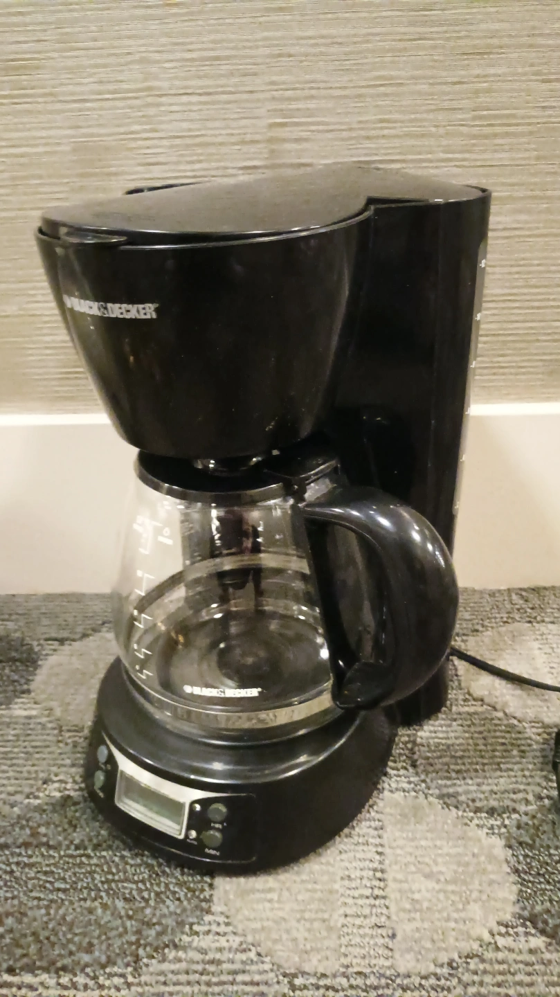 Programmable coffee maker. Black plastic housing. Glass carafe. Digital timer. Used condition.
