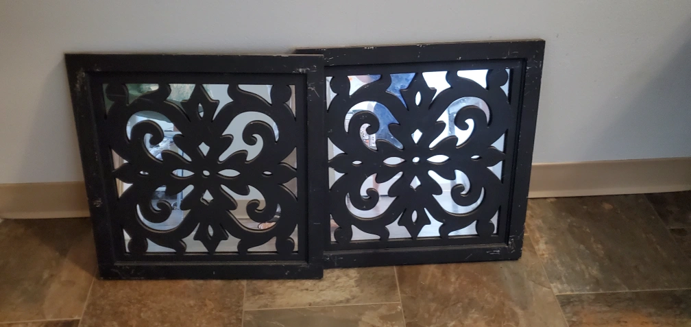 a set of two decorative wall mirror panels. They feature a black frame with an intricate floral cutout design over a mirror. There are some signs of wear and tear on the frames. FREE PICK UP BOWNESS