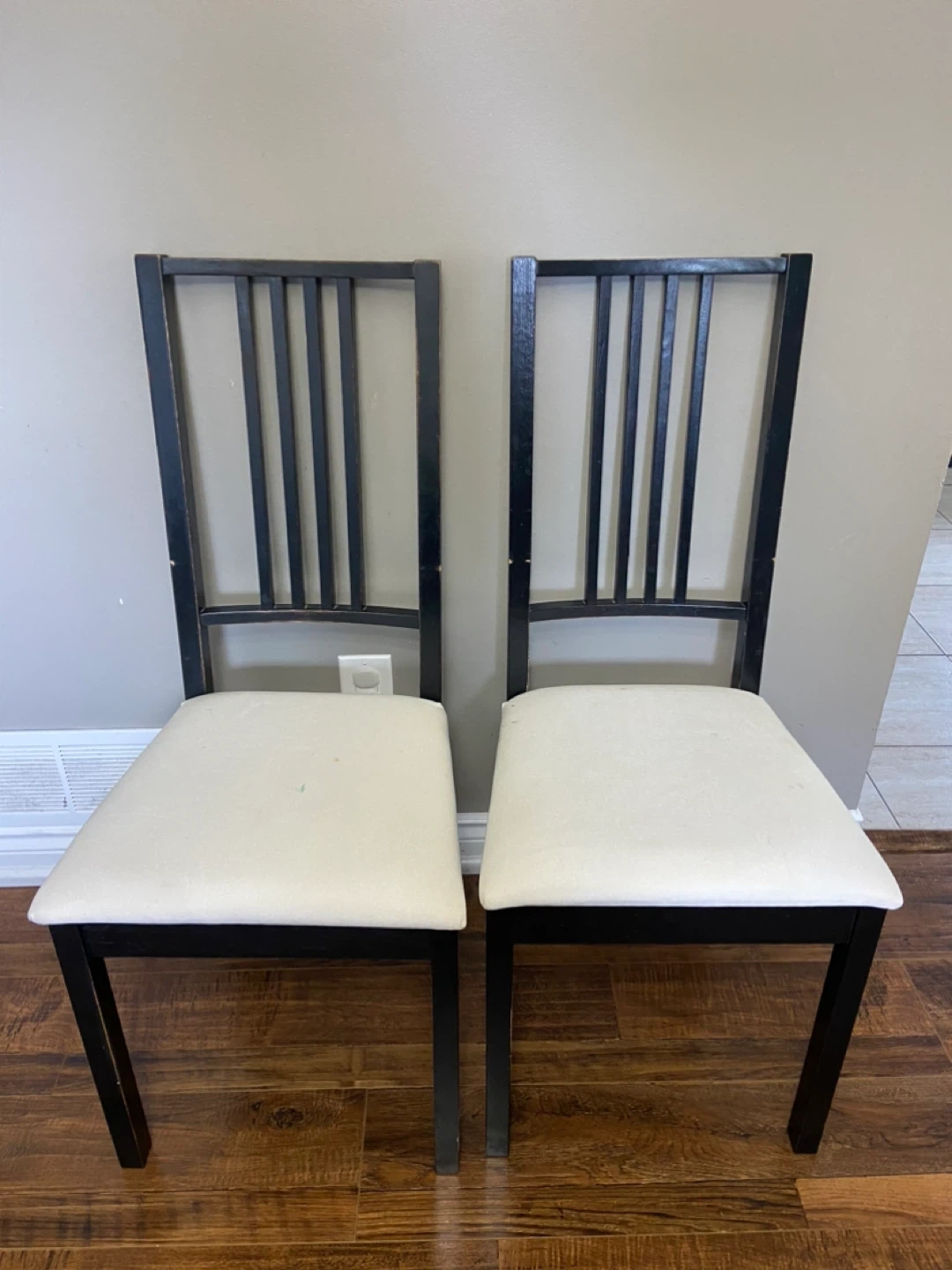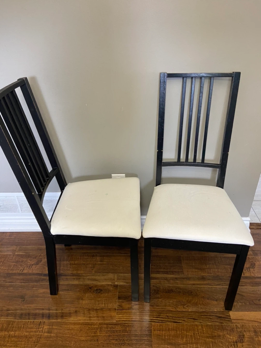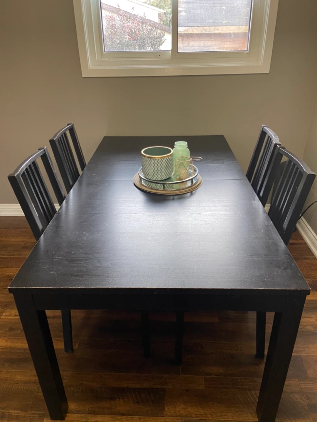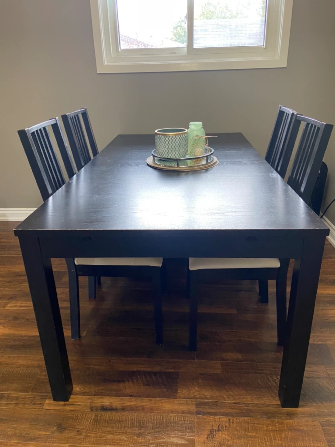 Selling a dining table with a set of four dining chairs. They have a black wooden frame and cream-coloured cushions. They are in good condition and would look great in any dining room! Minor stains on cushions but can be removed