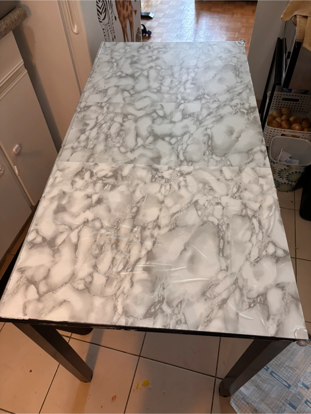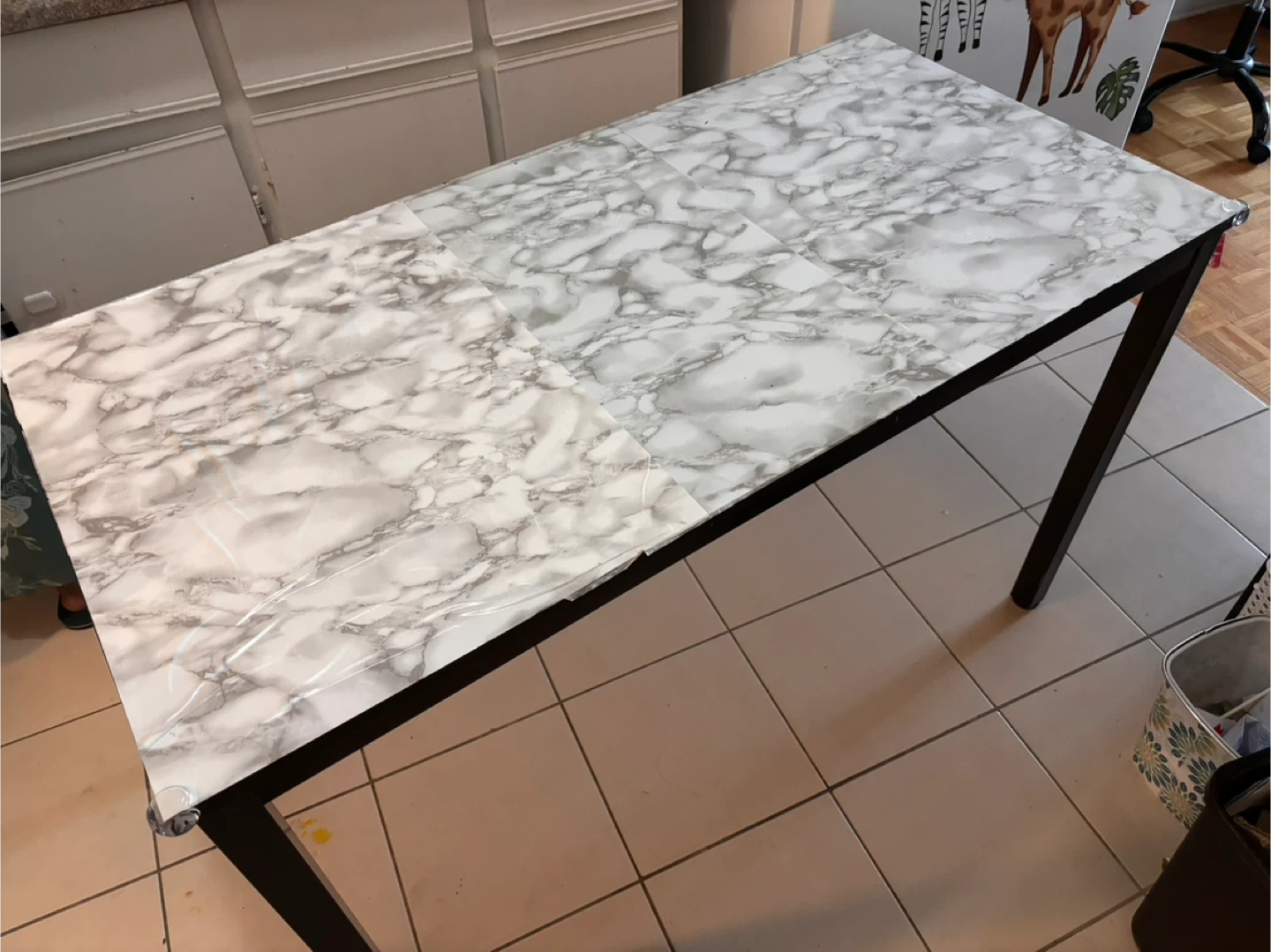 Dining Table with 6 Chairs - Marble Top, White Leather