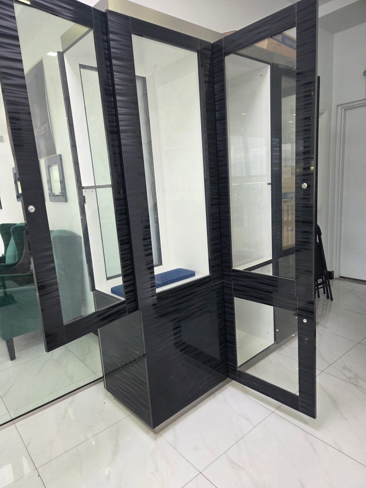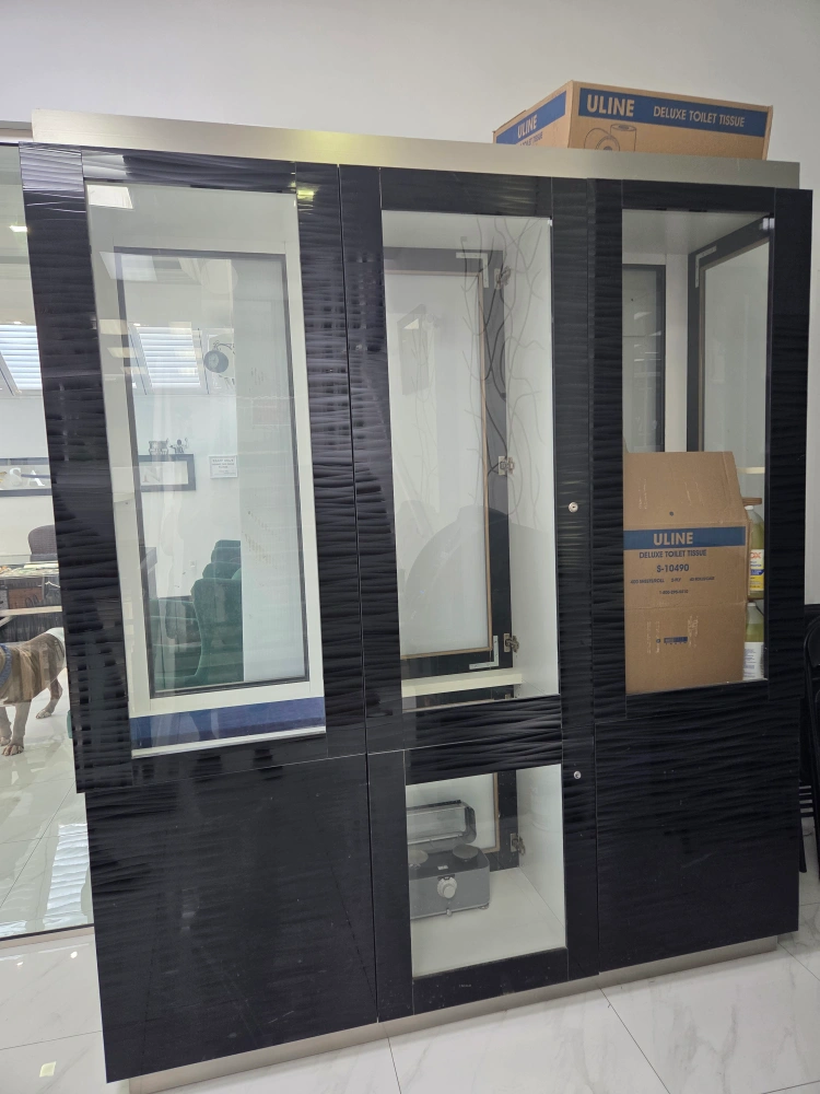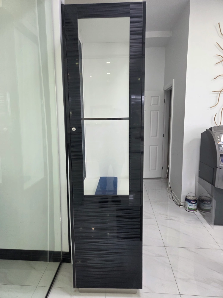 Selling a display cabinet with a black frame and glass doors. It's in great shape and would be perfect for showcasing items in your home or business custom made for jewelry showcase was $5000 you can pick up for $1500.
