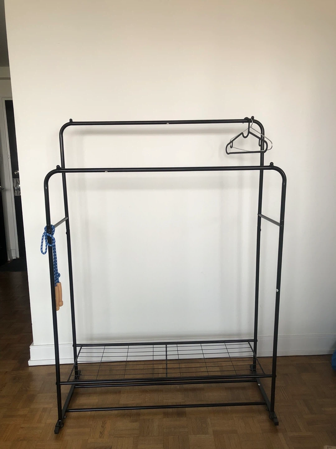 Selling a handy black clothing rack! It has two rods for hanging clothes and a shelf at the bottom for extra storage. Perfect for organizing your wardrobe or adding extra hanging space to your room