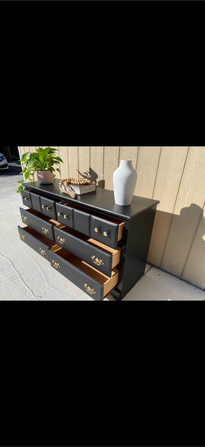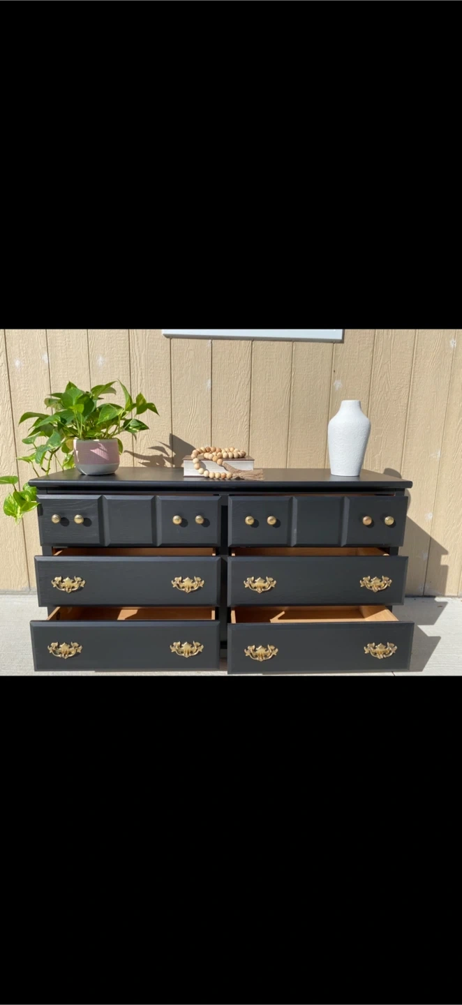 Selling a lovely black dresser with elegant gold hardware. It's perfect for adding a touch of sophistication to any bedroom or living space. All the drawers open smoothly, offering plenty of storage