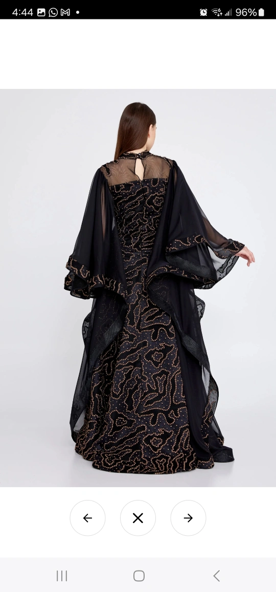 Beautiful black evening gown with delicate embellishments. Perfect for a special occasion or formal event. It has a sheer neckline and flowing sleeves that add a touch of elegance!