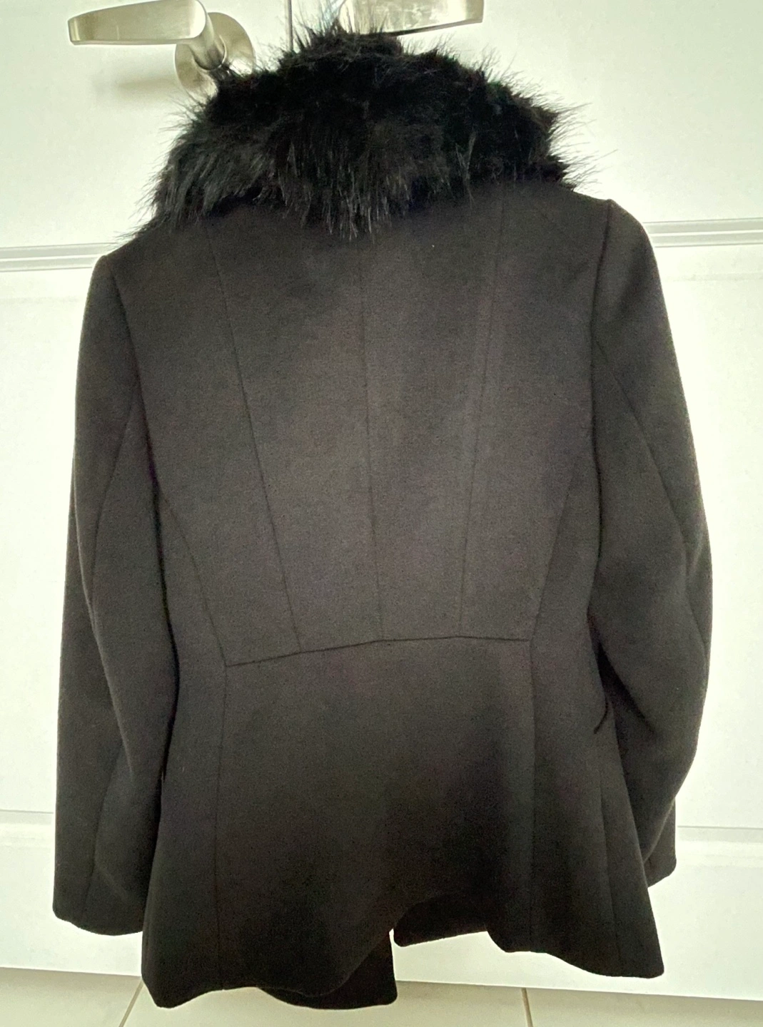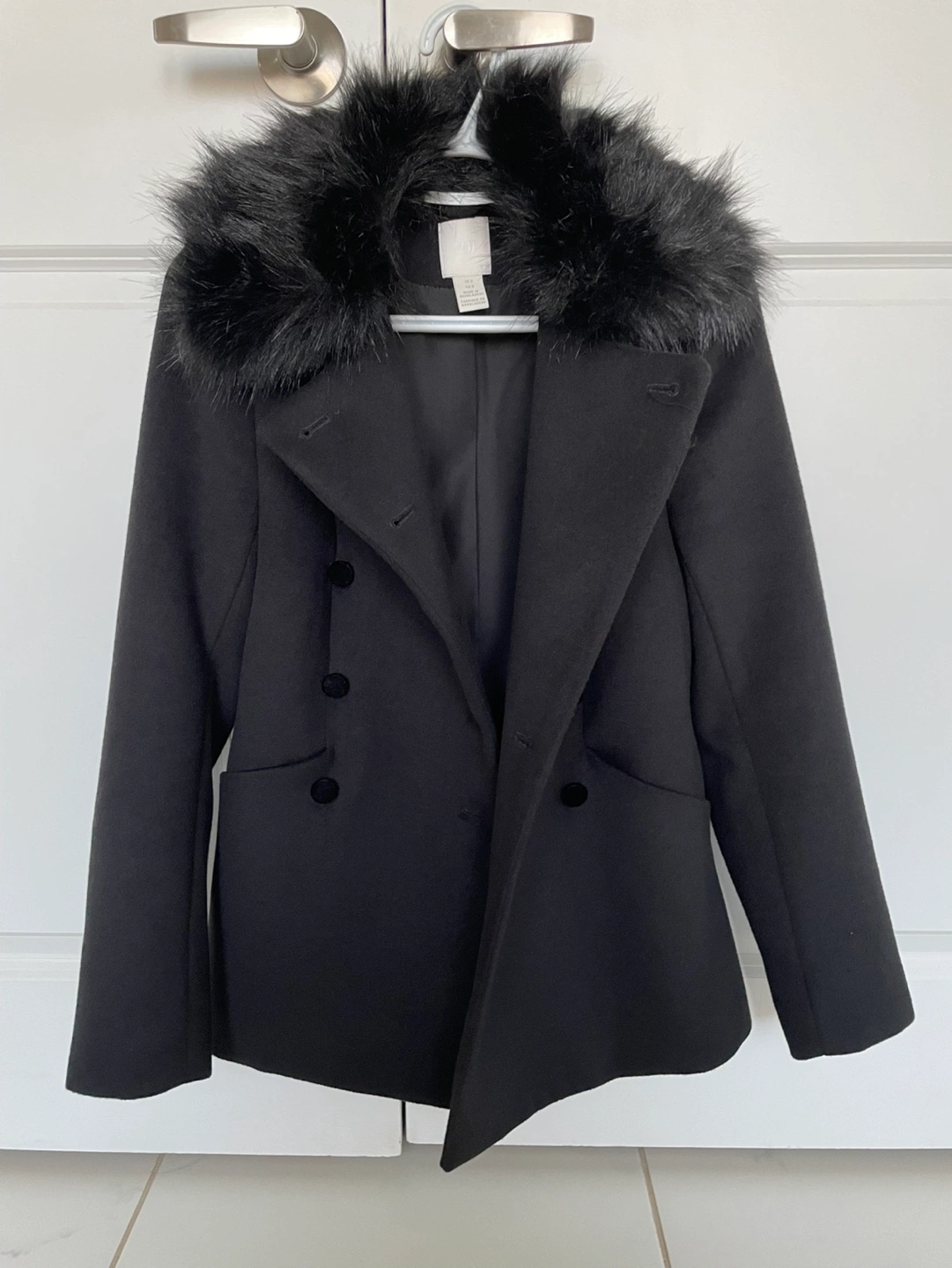 Black blazer with a faux fur collar. Double breasted with two pockets. Brand new/Never worn