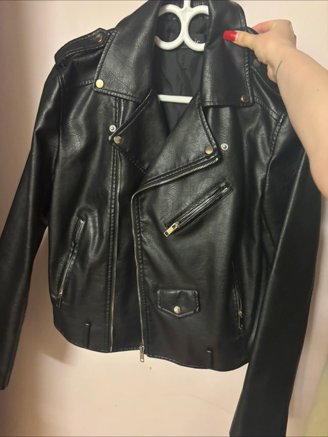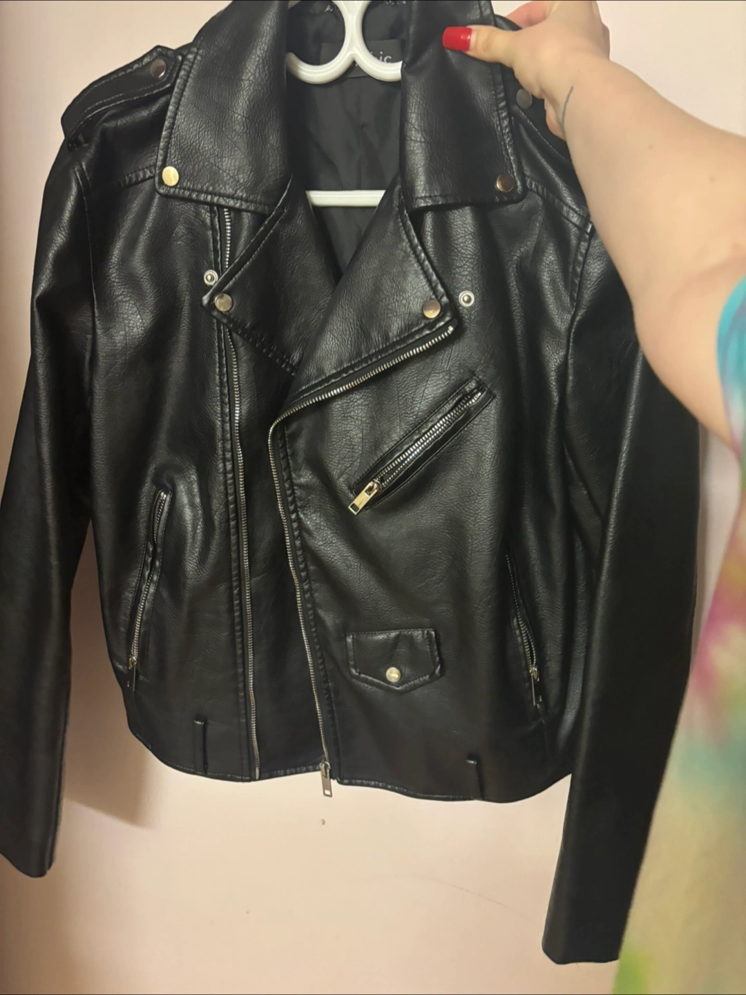 Selling a stylish black faux leather biker jacket. It's in great condition and perfect for adding a bit of edge to any outfit! The jacket features a classic asymmetrical zip closure, zippered pockets, and snap-down lapels.