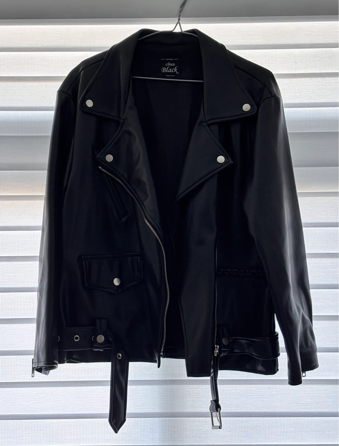 Selling a stylish Black faux leather jacket! It's in great condition and perfect for adding a bit of edge to any outfit. The jacket features details like an asymmetrical zip closure, snap-down lapels, and belted waist. A must-have for your wardrobe!