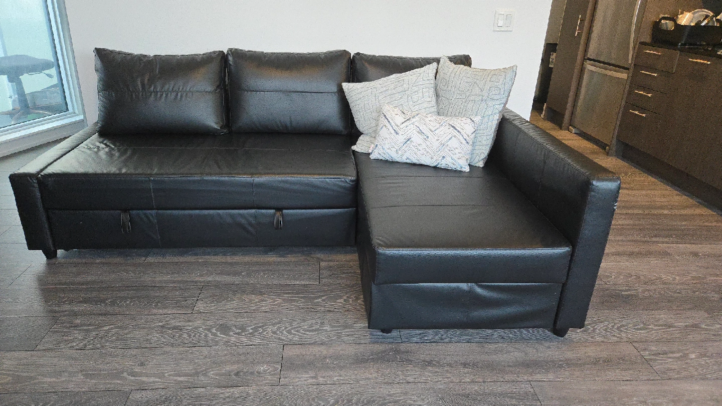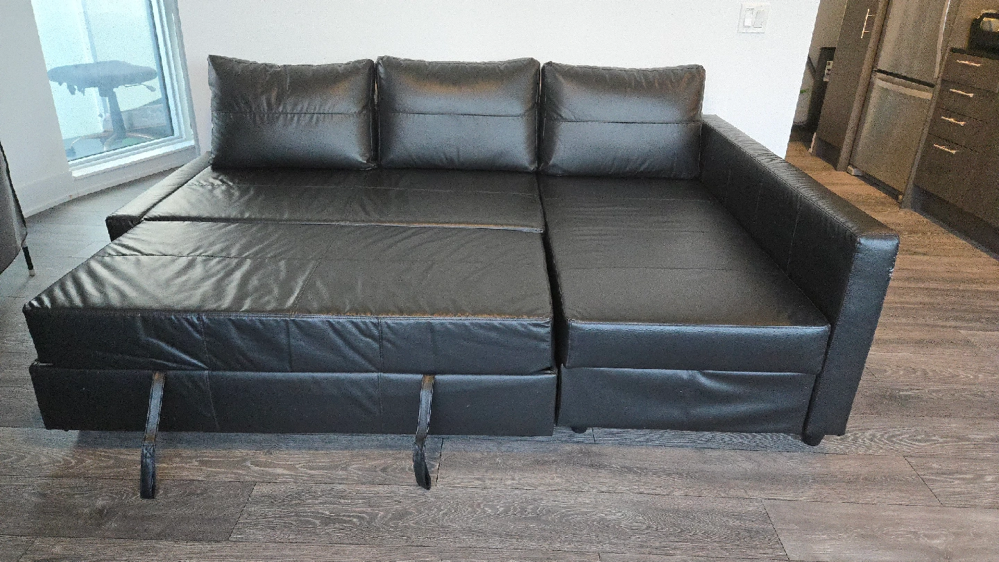 Selling a black faux leather sectional sofa bed. It's in good condition and perfect for a living room or spare room. The sofa easily converts into a bed, making it great for guests. (Open to offers below listed price)