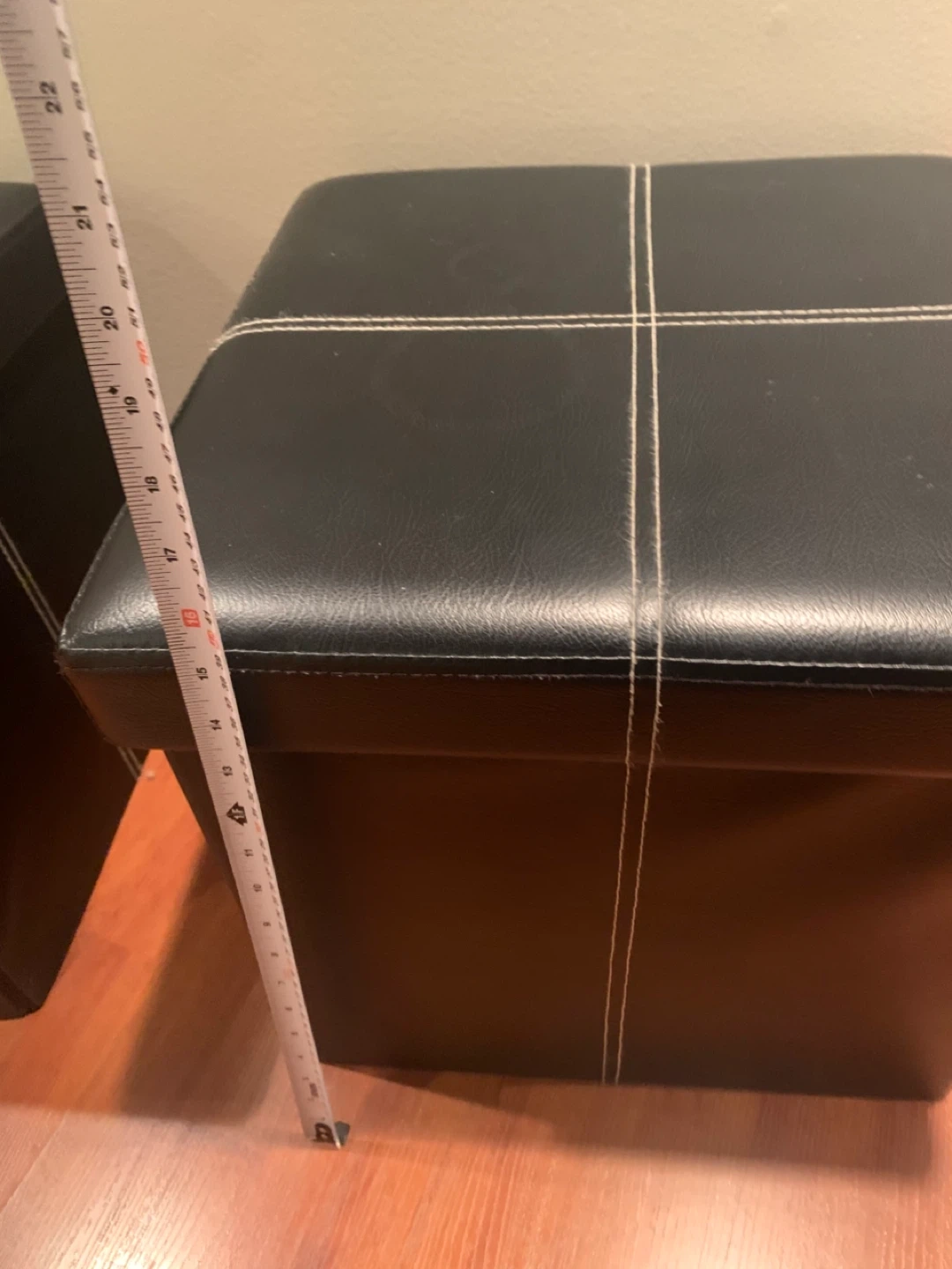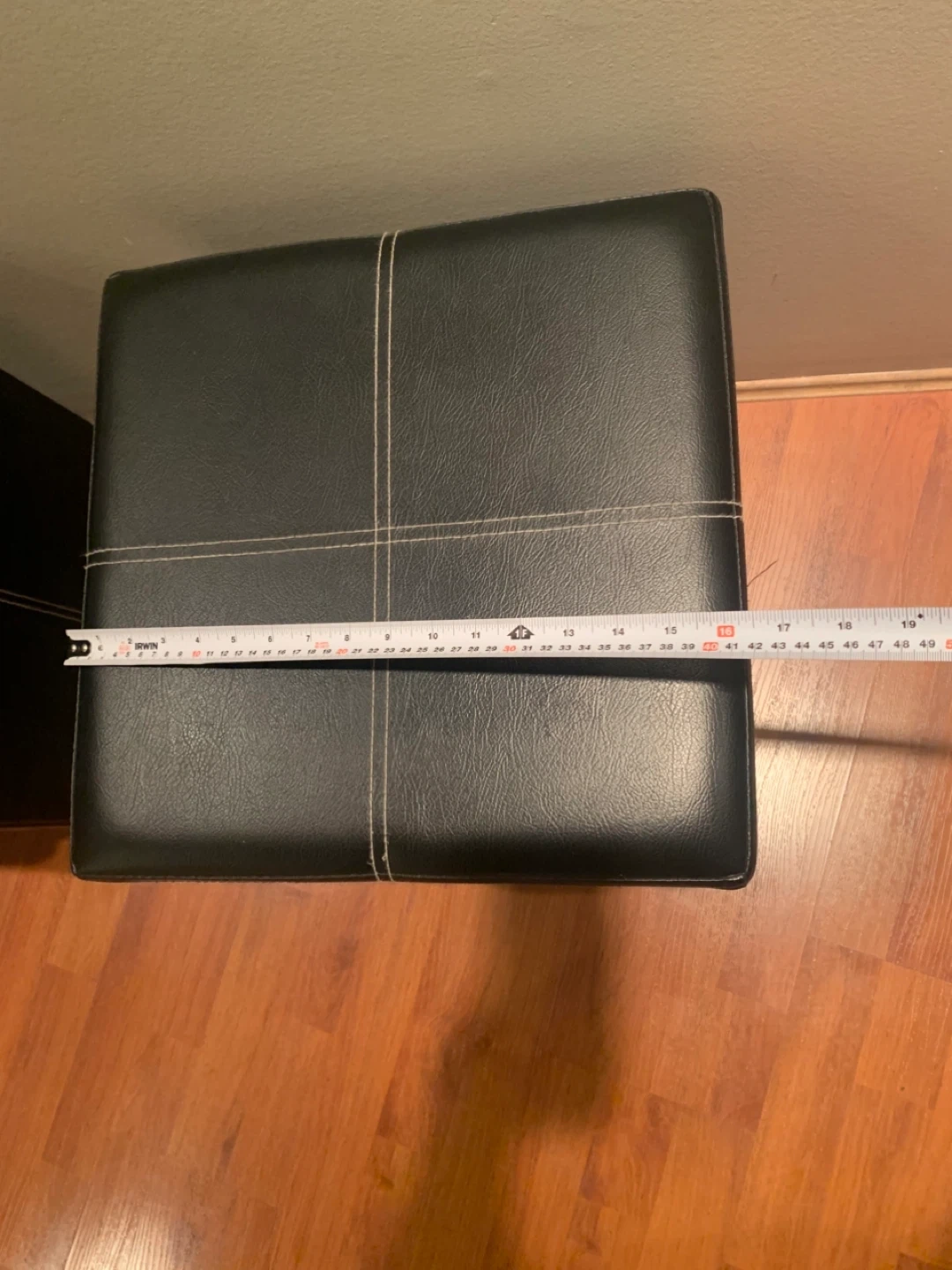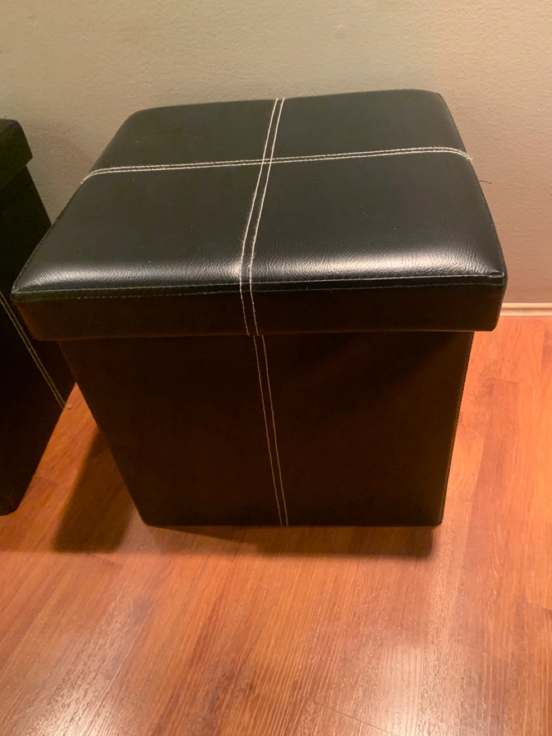 Here's a black faux leather storage ottoman. It's in good condition and measures approximately 17 inches in height and width. Perfect for extra seating and storage!