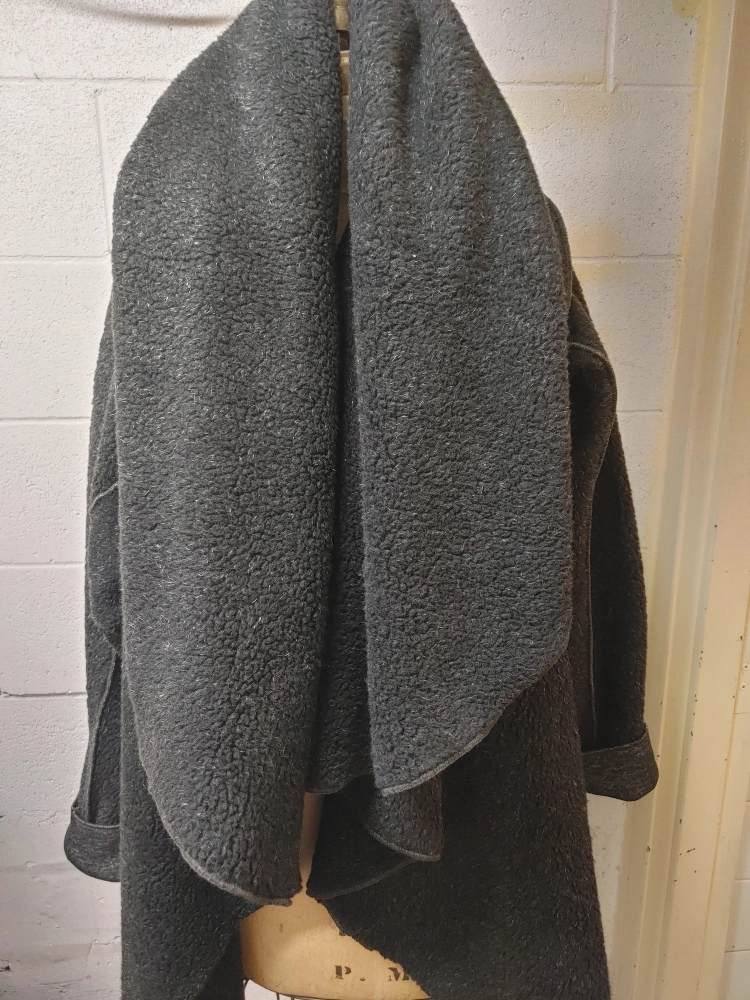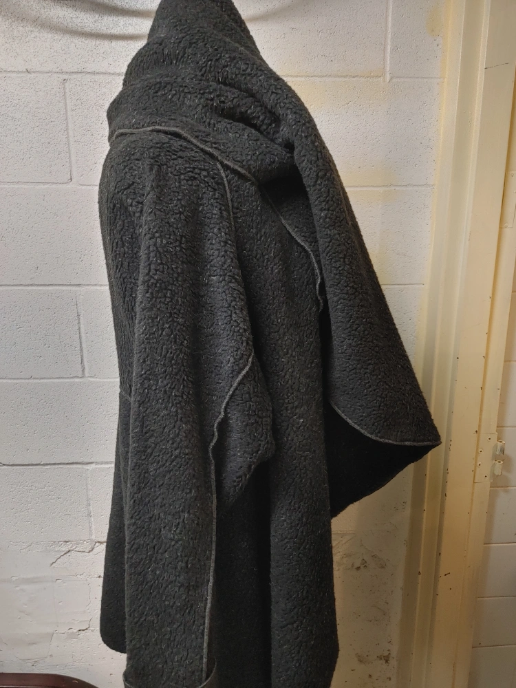 A black fleece wrap coat with long sleeves and a cowl neck. The coat is made of soft, comfortable fleece and has a relaxed fit. The coat is perfect for layering in the colder months.