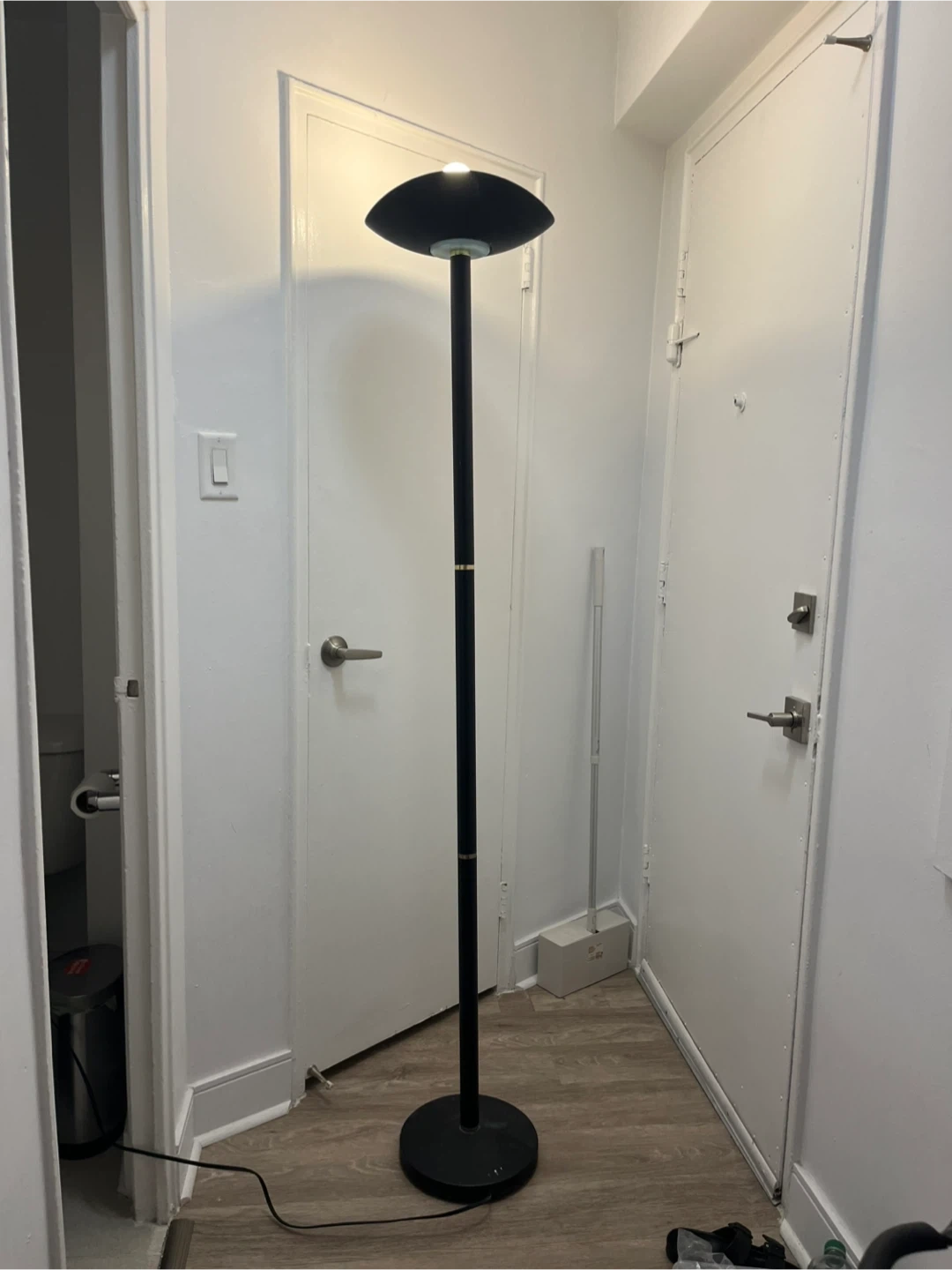 Selling a simple black 6ft tall floor lamp. It's in good condition and provides a nice ambient light for any room. Shines light upward to the ceiling. Perfect for adding a touch of style to your living space or bedroom. Can be taken apart for easy moving. (Bulb not included)