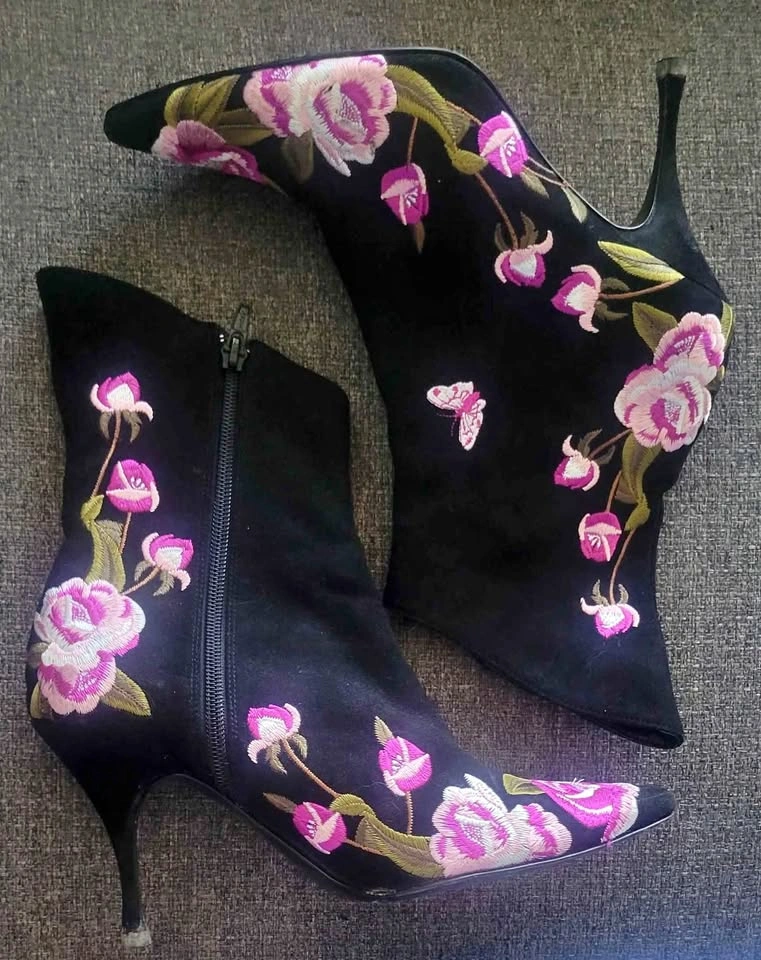 Stunning black stiletto boots featuring intricate pink floral embroidery. Perfect for nights out, parties, or adding flair to any outfit! A striking, one-of-a-kind pair for someone who loves bold fashion pieces. * Black suede-look material with pink/purple/green floral embroidery * Pointed toe & slim stiletto heel * Side zip closure for easy wear * Eye-catching and unique design ⚠️ **Condition:** Preowned. Still very wearable, but **interior lining shows flaking/peeling (see photos)**. Exterior embroidery and heels are in great shape!