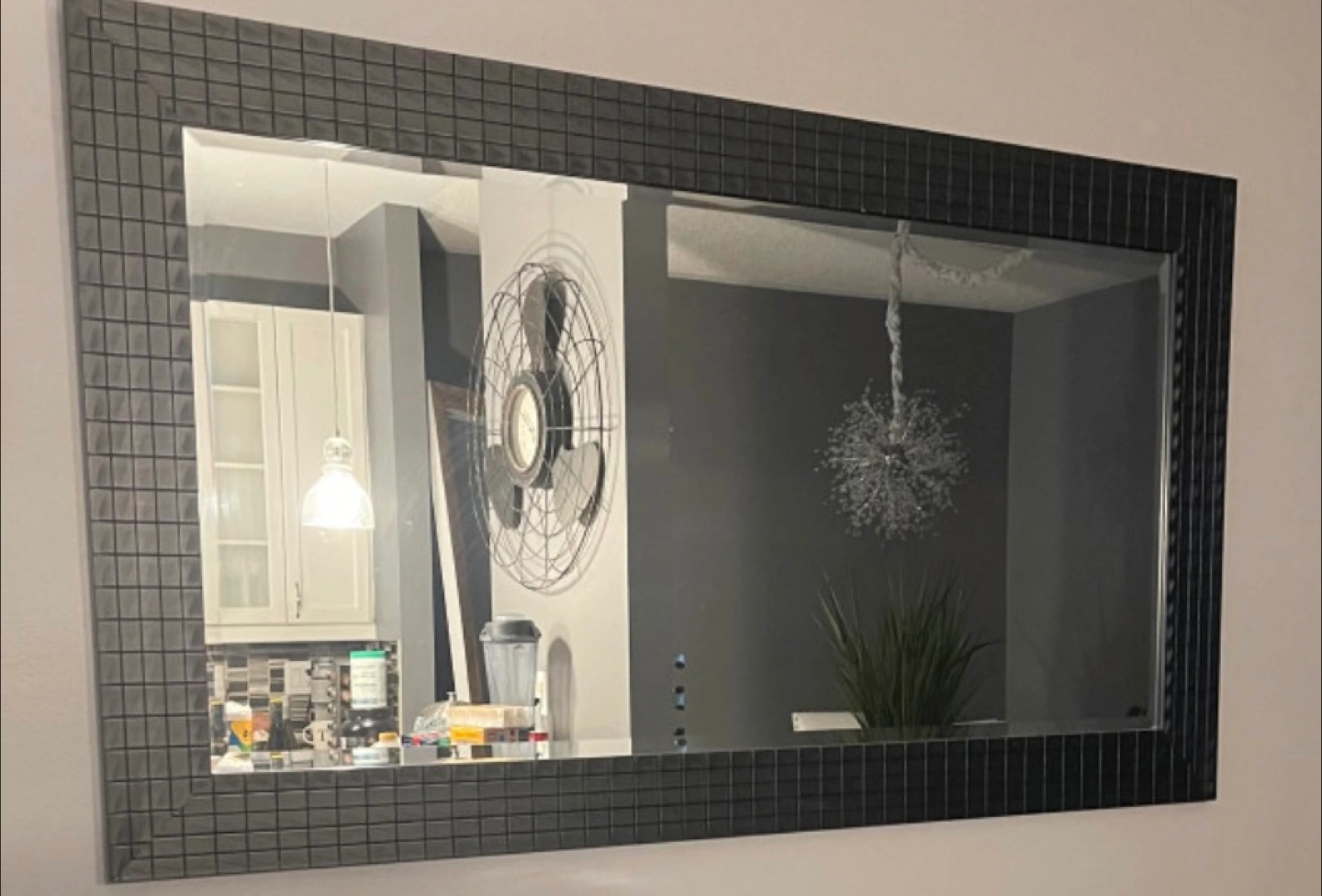 Selling a nice black framed mirror. The frame has a unique tiled design. It would look great in a bathroom or entryway!
