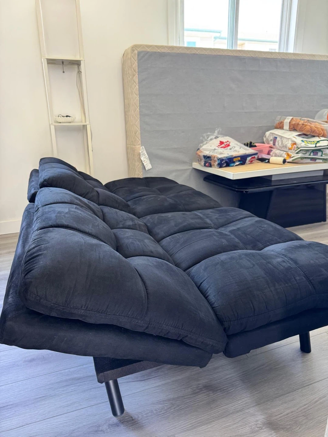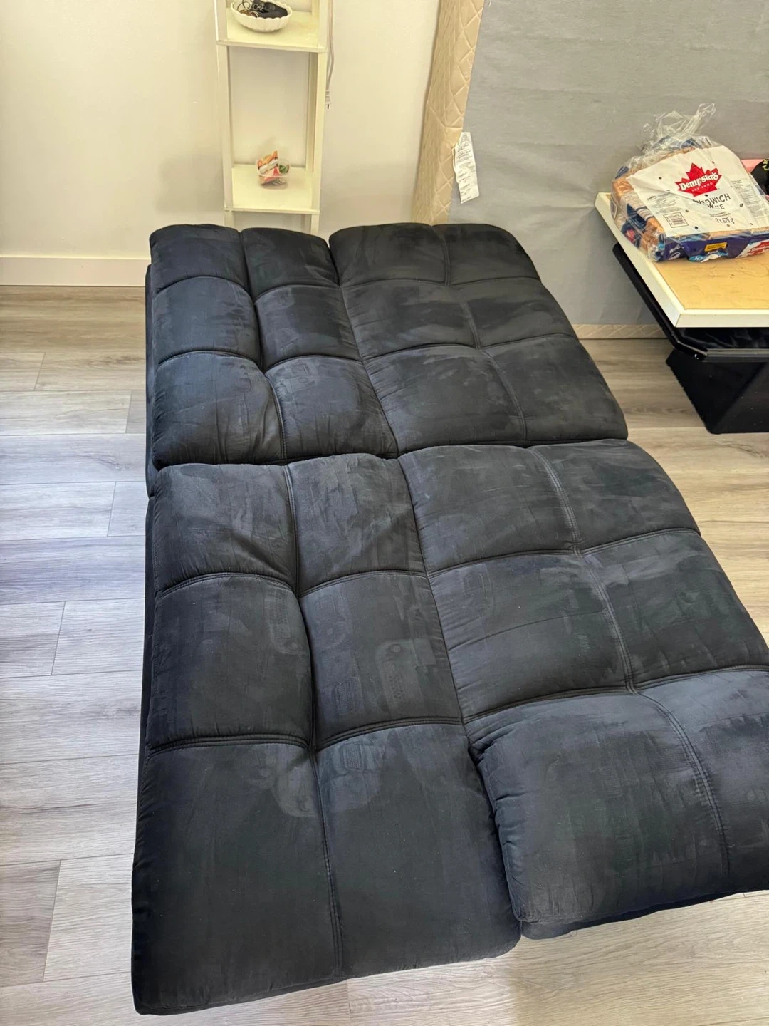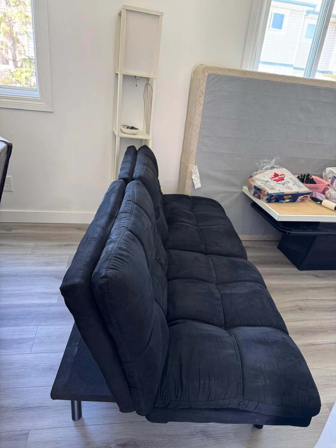 Selling a black futon sofa bed in good condition. It's perfect for small spaces and can be used as a sofa or a bed. It's a great addition to any living room or guest room