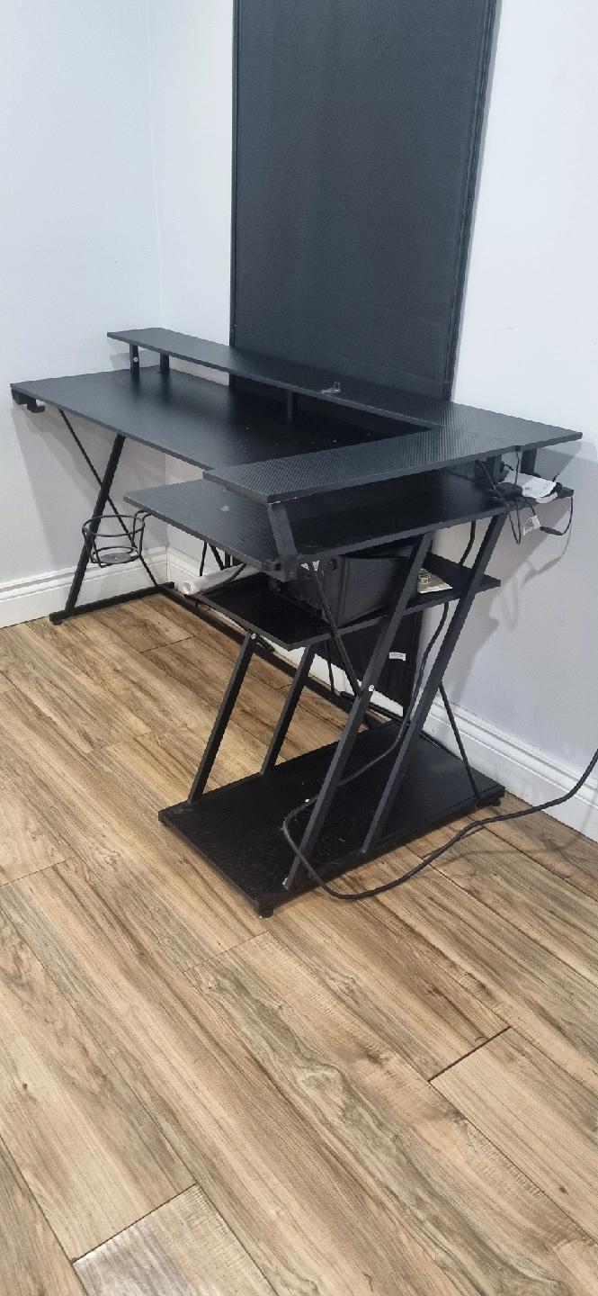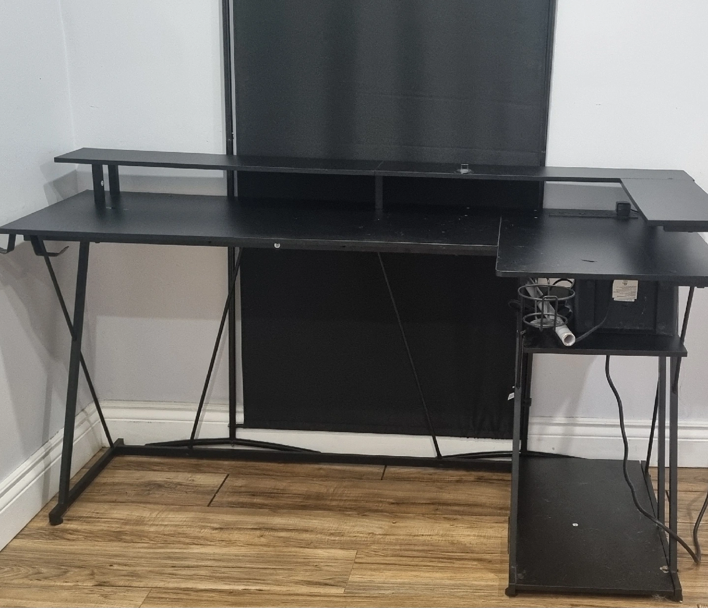 Selling a black gaming desk! It's in great shape and ready for a new home. It features a raised shelf for your monitor and a convenient side platform. Perfect for setting up your gaming station!