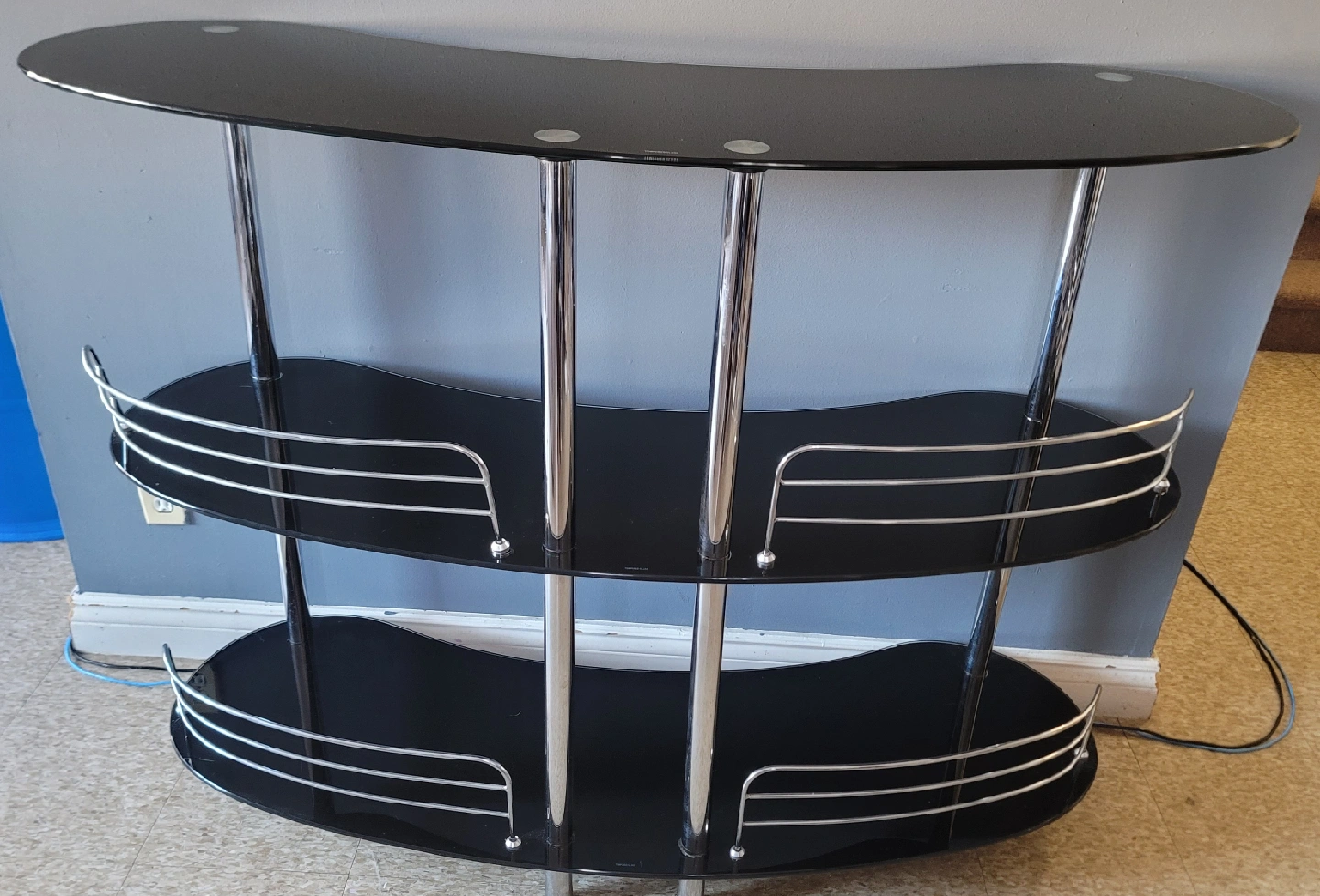 Selling a stylish bar table with a sleek black glass top and a shiny chrome frame. It features two shelves, providing ample space for storage or display. The curved design adds a modern touch to any room. Perfect for entertaining or adding a touch of elegance to your home!