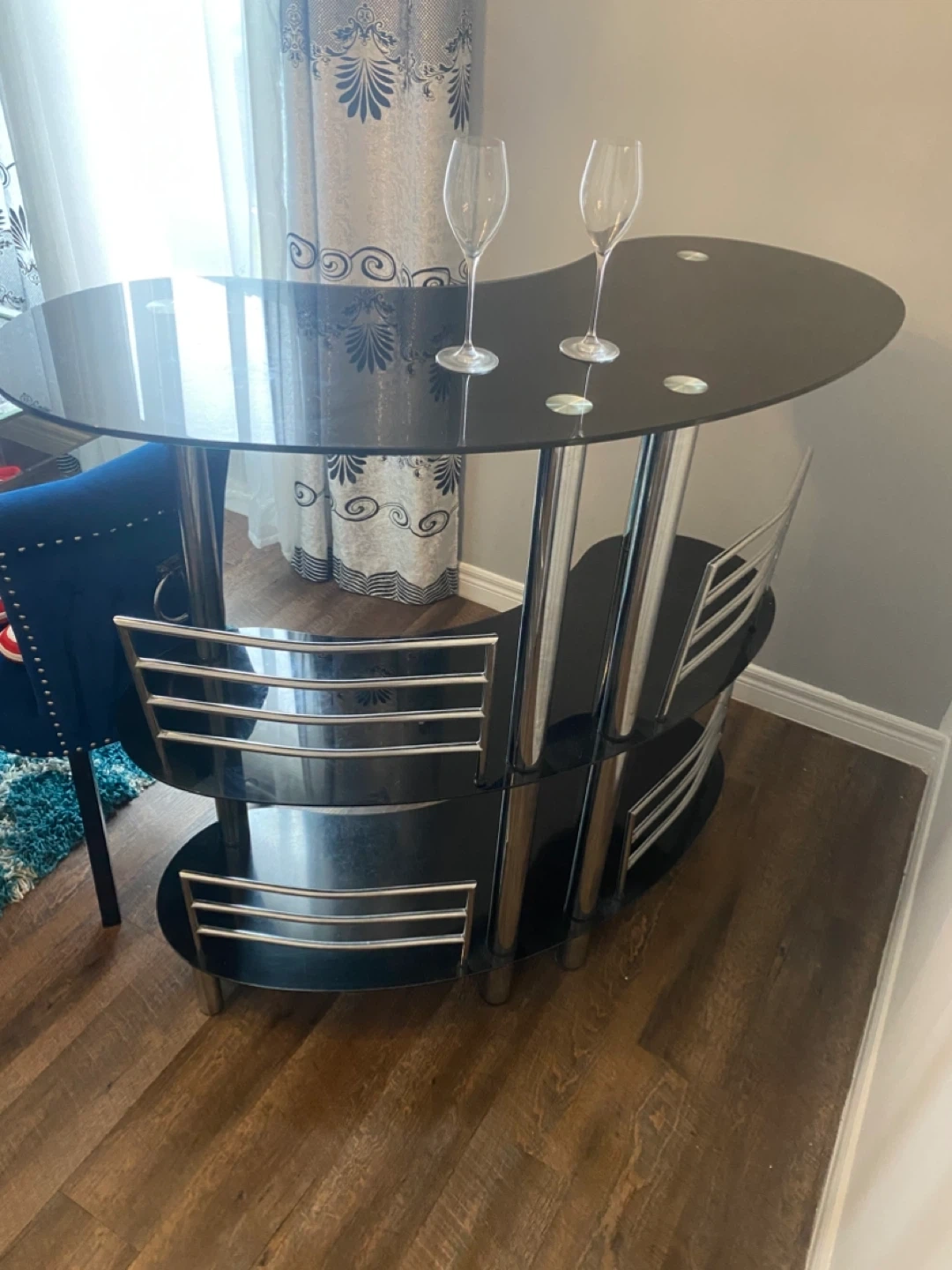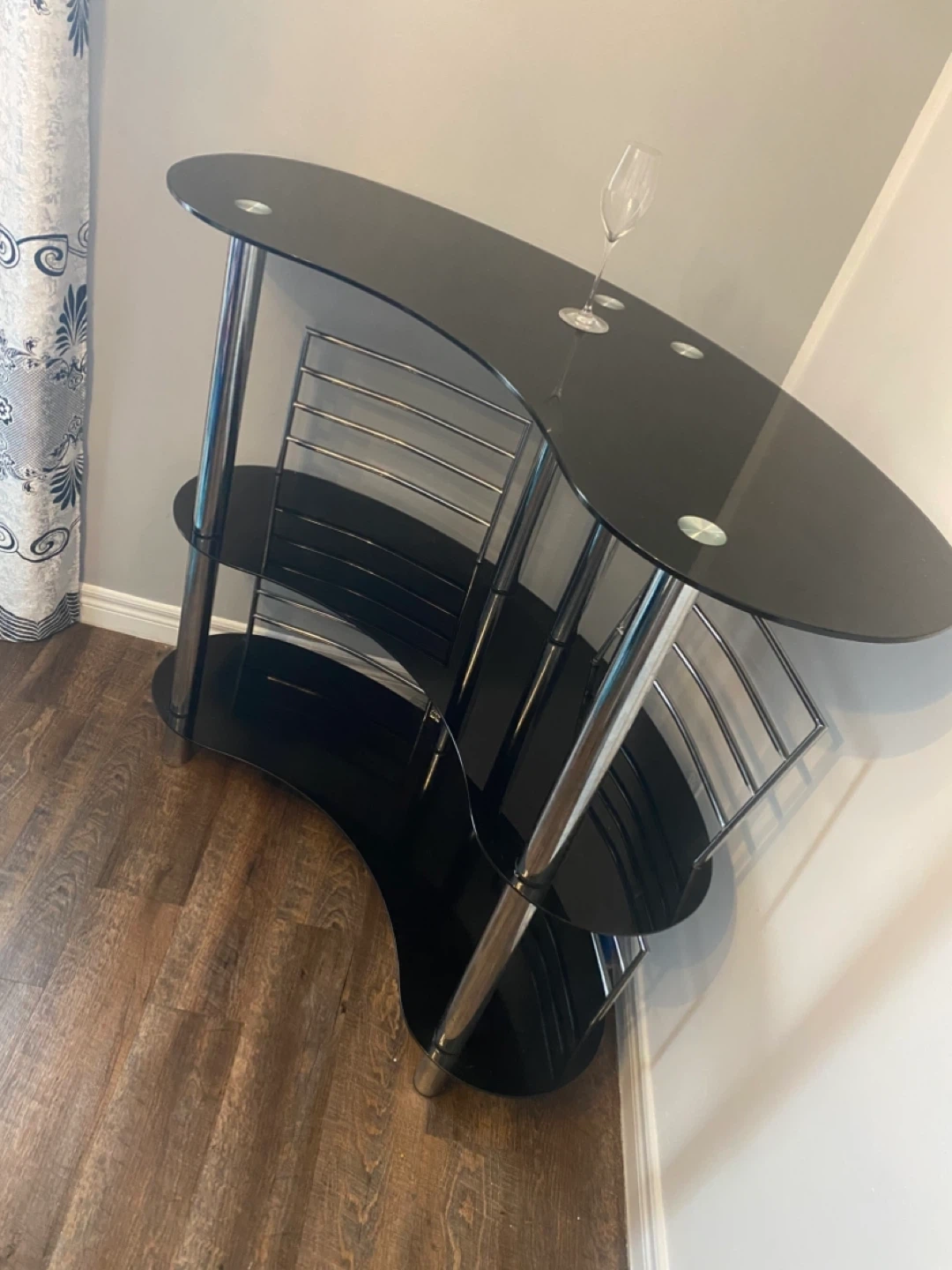 Selling a stylish bar table featuring a sleek black glass top and a modern chrome frame. It's perfect for adding a touch of elegance to your home bar or entertainment area. The table includes shelving for storage. Great condition!