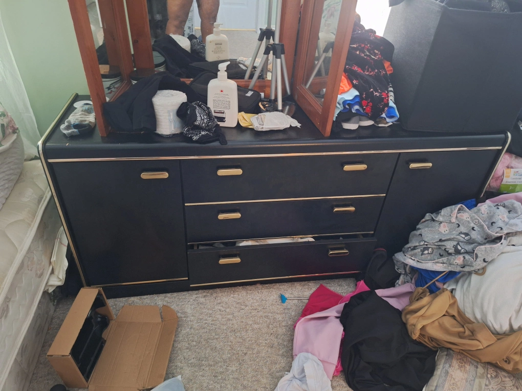 Selling a dresser with a mirror. It features a sleek black finish accented with gold trim and hardware. It has a combination of drawers and cabinet space for storage. Perfect for adding a touch of elegance to any bedroom!