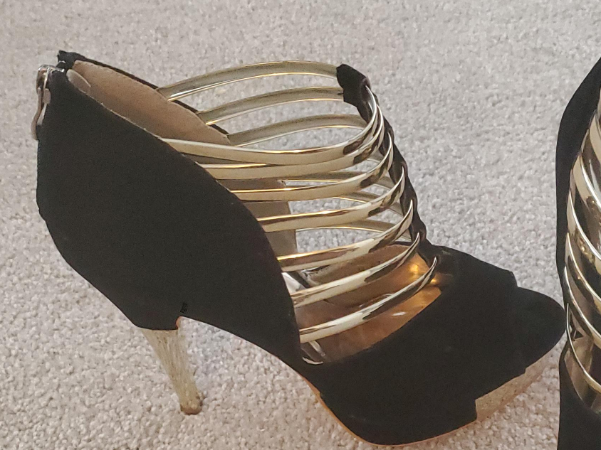 These black and gold heels are in great condition! They feature a stylish open-toe design with gold straps and a zipper closure at the back. Perfect for a night out or a special occasion!