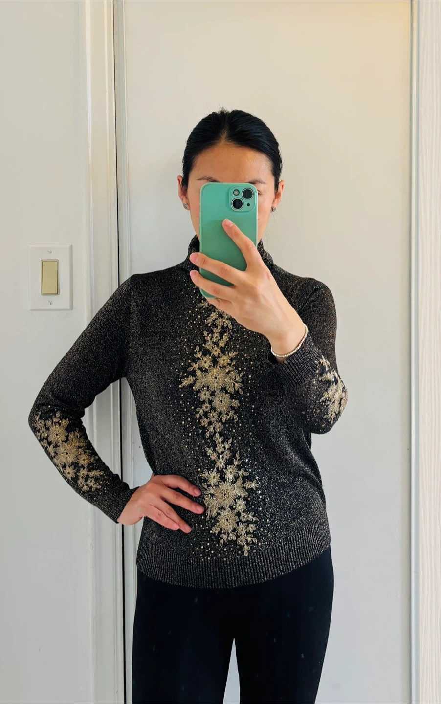 Here's a lovely black and gold turtleneck thin sweater! It features a beautiful snowflake design. Perfect for the winter season or a festive occasion. A stylish addition to any wardrobe! The price is firm, missing some of the beads, (that’s why it’s this price ), but doesn’t affect its beauty, please don ’t proceed if you mind, thanks for your time! 😊🤝💝☀️