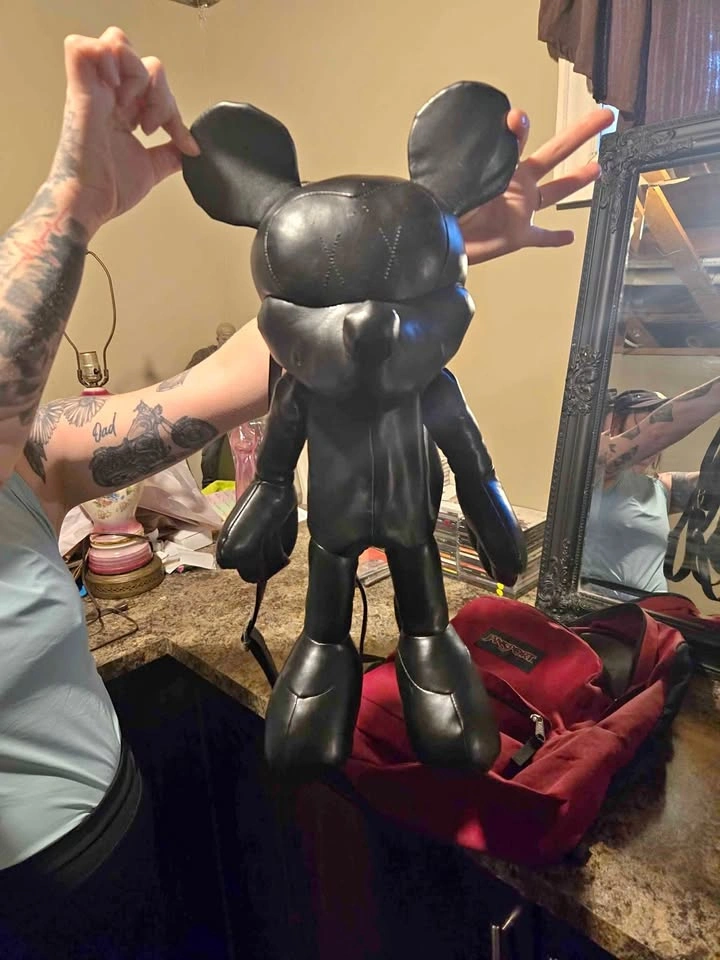 This unique black Mickey Mouse backpack is a statement piece for any Disney enthusiast! Though pre-loved, it still has plenty of character to offer. There are a couple of small scuffs on the head (see photos). Perfect for adding a touch of whimsy to your day. It's not just a backpack; it's a conversation starter.