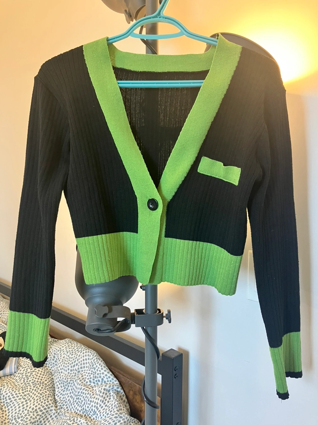 Cute cropped black cardigan with green accents, in excellent condition. Features a button closure and a unique design. Perfect for layering or wearing on its own. Size free (S/M) Pickup available at Sheppard-Yonge or Sherbourne station.