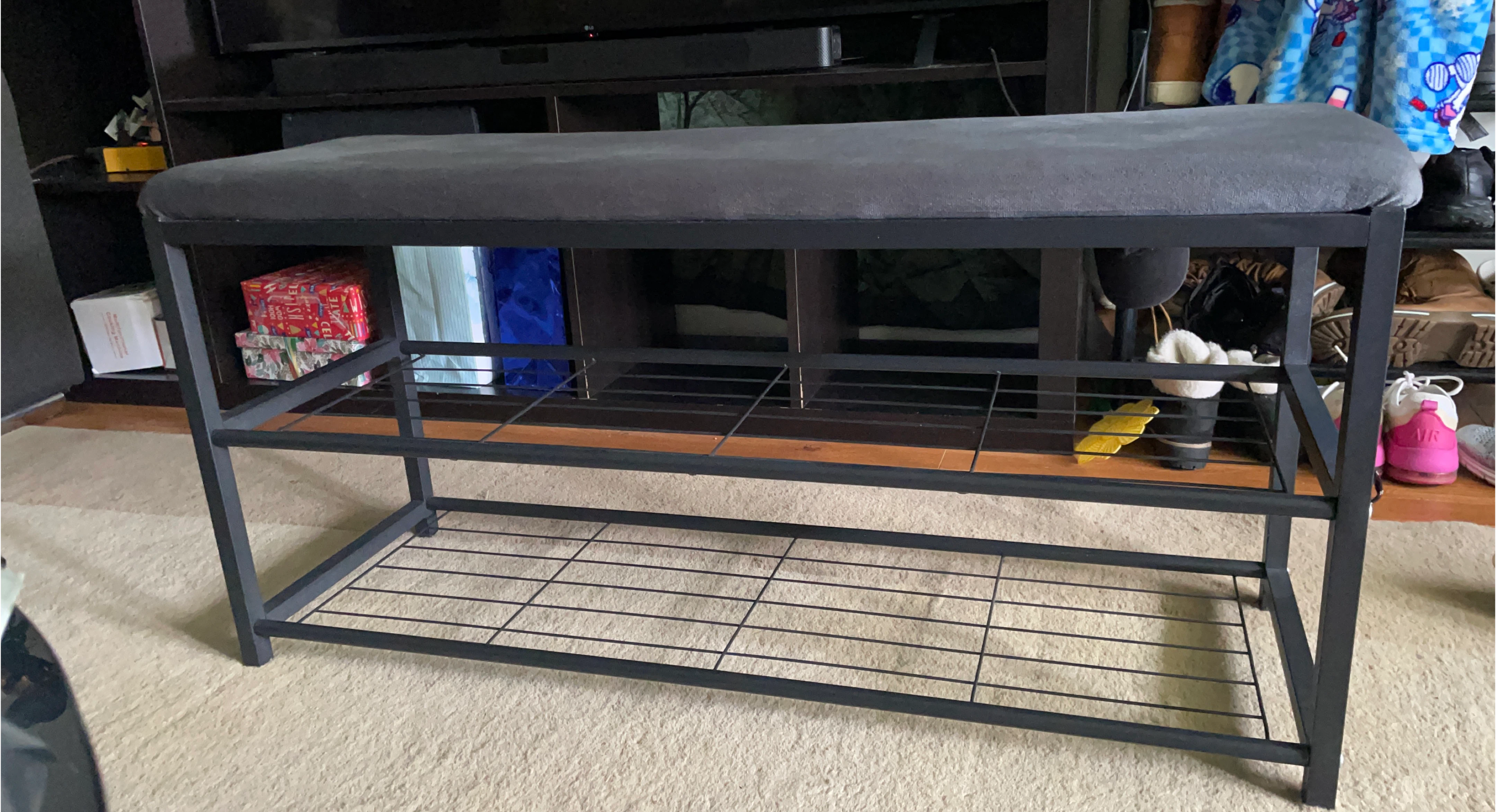 Selling a shoe rack bench with a padded seat! It's in good condition and perfect for an entryway or closet. It has a black metal frame and a dark grey cushioned top. Great for storing shoes and providing a place to sit while putting them on. It is 2 months old so it’s like new!
