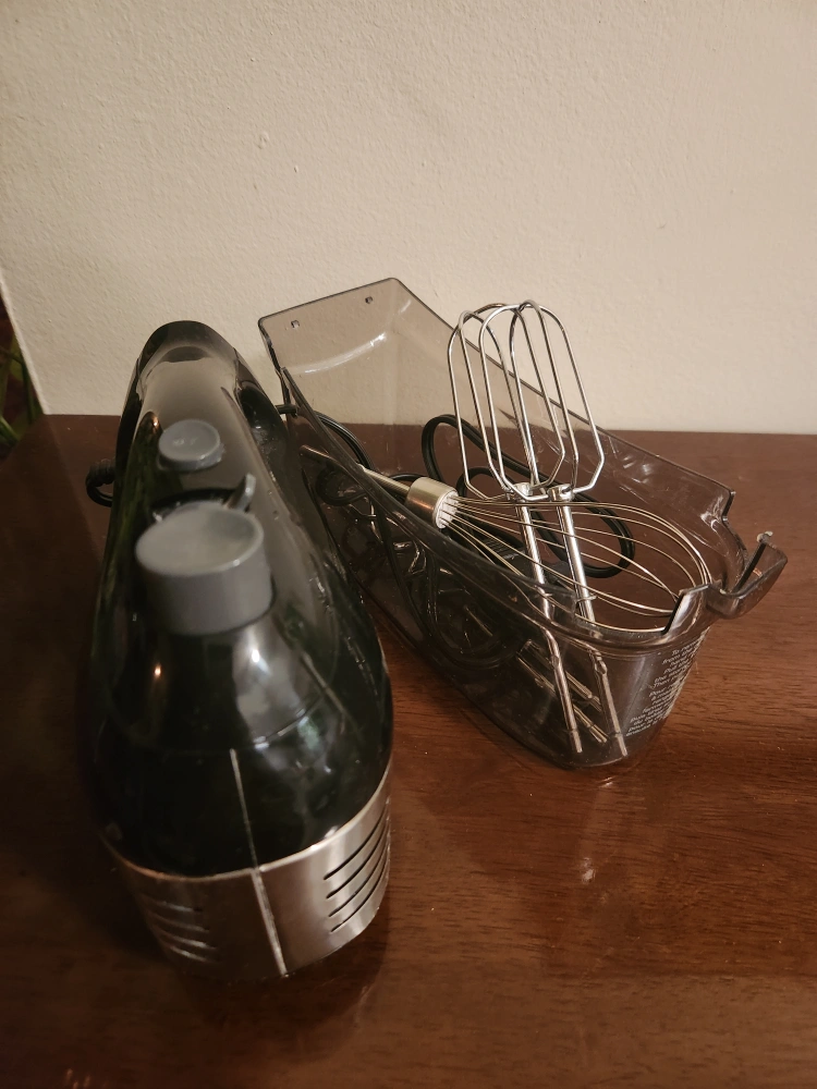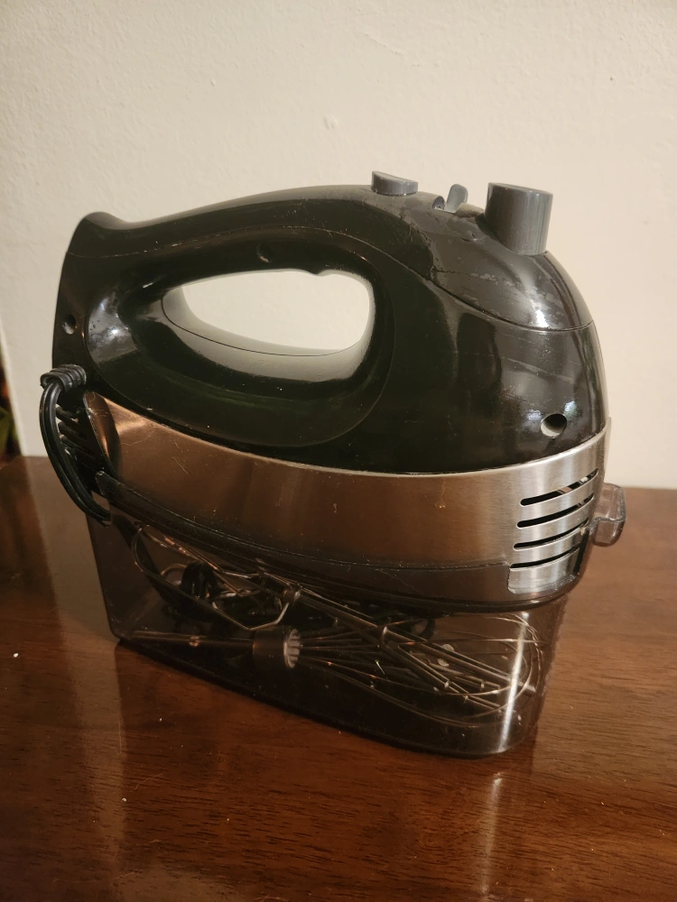 I'm selling a used black hand mixer. It comes with whisk attachments and a storage case. It's perfect for baking and small mixing tasks in the kitchen. pick up only
