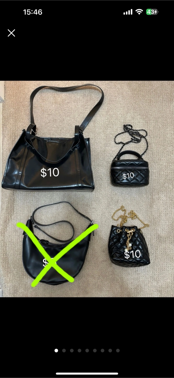 Selling these cute black handbags for $10 each! There's a larger tote style bag and a small quilted vanity style bag. Perfect for adding a touch of style to any outfit!